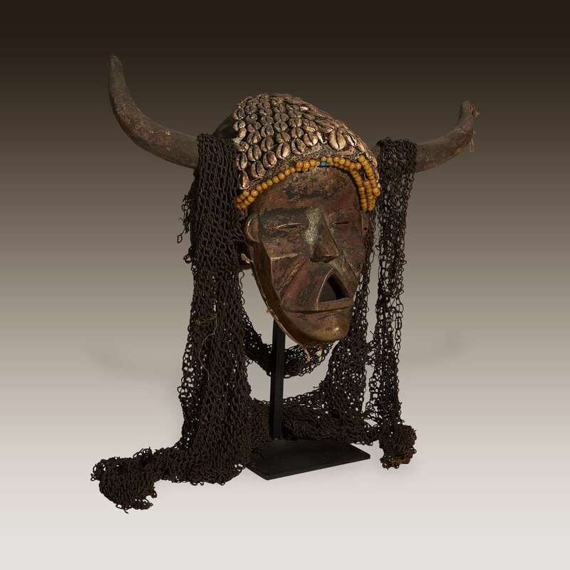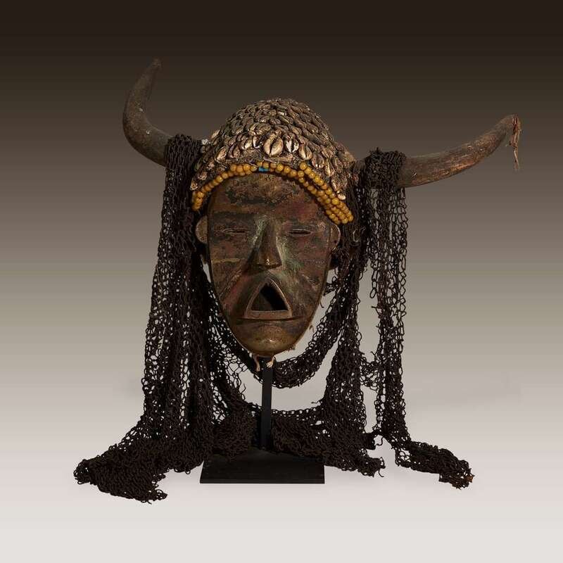 Carved wood, the domed brow above recessed thin eyes, prominent cheekbones and an open triangular mouth, wearing an elaborate headdress of fiber netting, cowrie shell, beads and cow horn, raised on a bespoke mount.