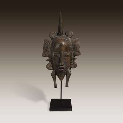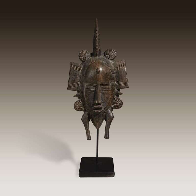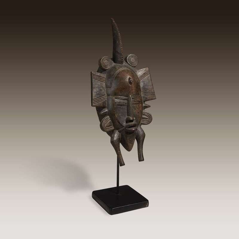 Carved wood, the oval face with pursed mouth, the eyes pierced with slits, two pairs of flanges on each side of the face and two projections emanating from the chin, the forehead topped with a horned crest, with painted inventory number '844' to reverse, raised on bespoke mount.