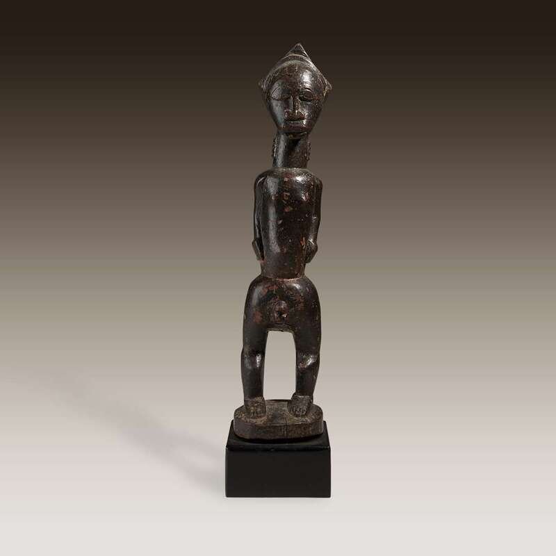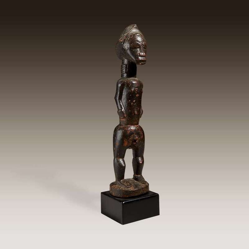 Carved wood, shown standing on an integral plinth, the left foot turned slightly inwards, the arms held to the sides, the long neck with scarification marks the sides, the facial features reduced to the essence of form, with a three-part coiffure.