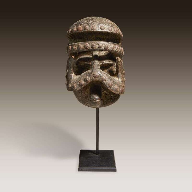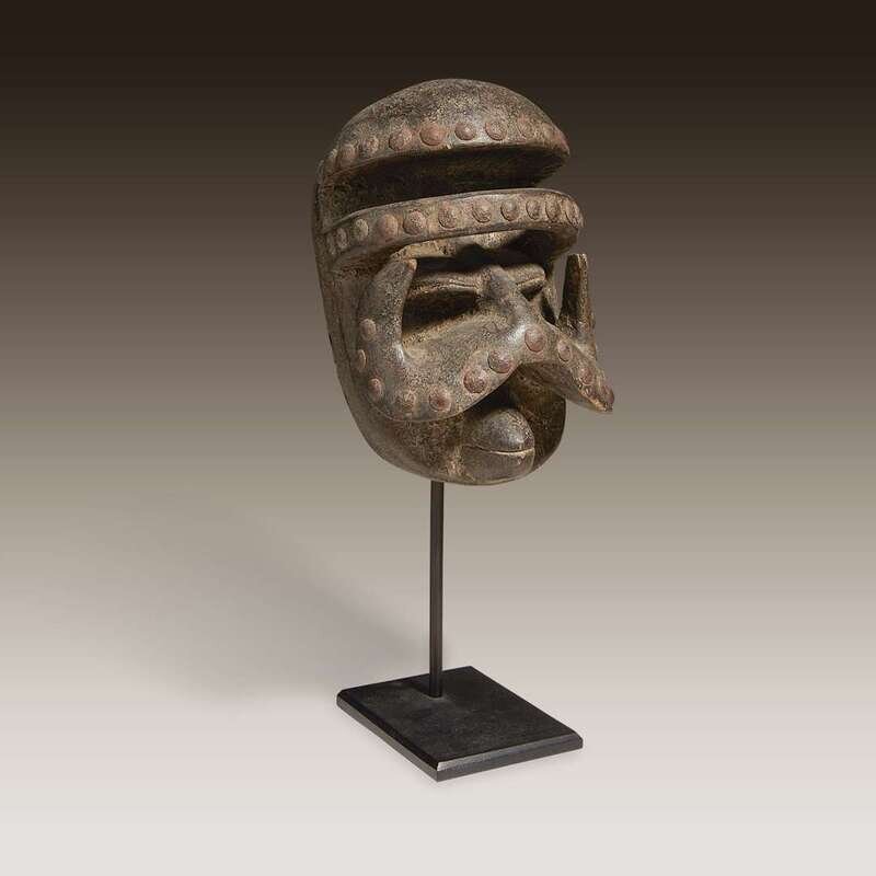 Carved wood and metal, the protruding forehead above a raised ridge, the nose flaring outwards into separate flanges, the mouth balanced between, covered in brass tacks throughout, perforated at the sides for attachment, raised on a bespoke mount.