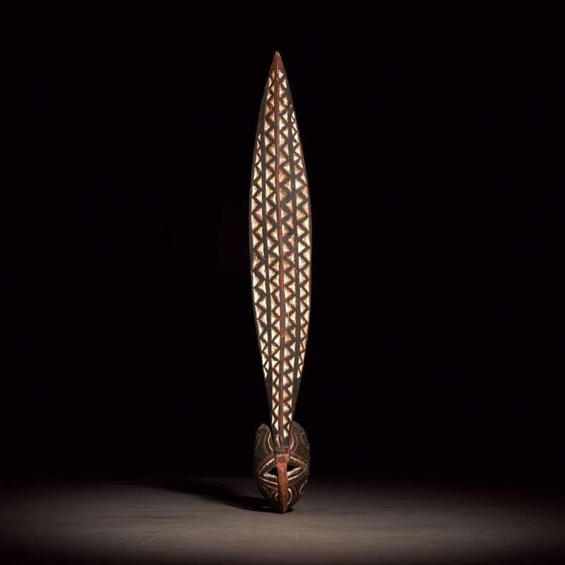 Carved wood and pigment, the hollow domed face with dual perforations for the eyes, surmounted by a central tapering crest decorated with raised zig-zag pattern, with bespoke wall mount.