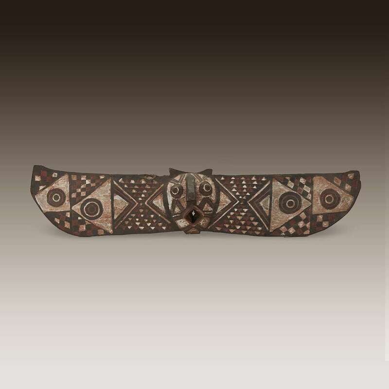 Carved wood and pigment, the central face with protuberant square mouth and prominent nose, the wings decorated with concentric circles and geometric patterning.