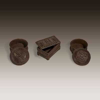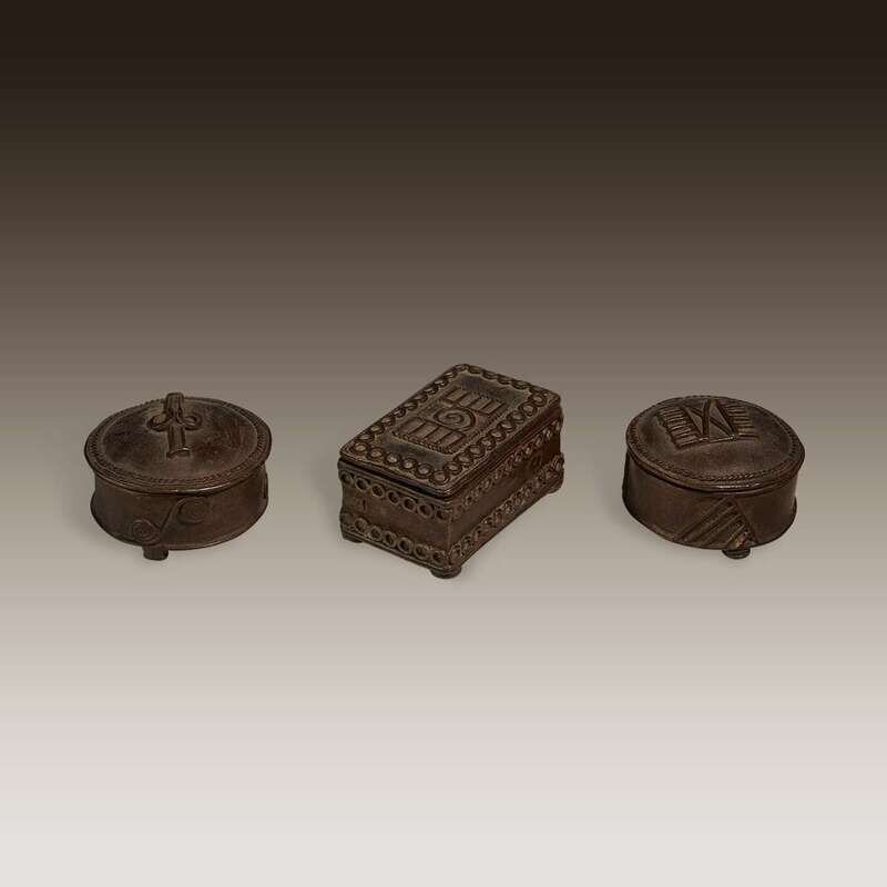 Cast copper alloy, consisting of two circular and one rectangular example, all three with separate lids and geometric decoration to the tops. (3).