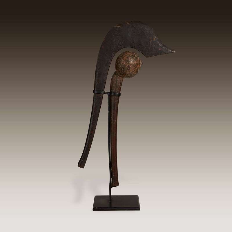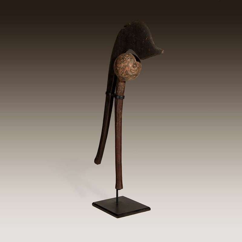 Comprising an anthrophonic wooden club with a long arched shaft, a human face carved into the spherical head; a club with a distinctive hooked head, mounted together. (2).
