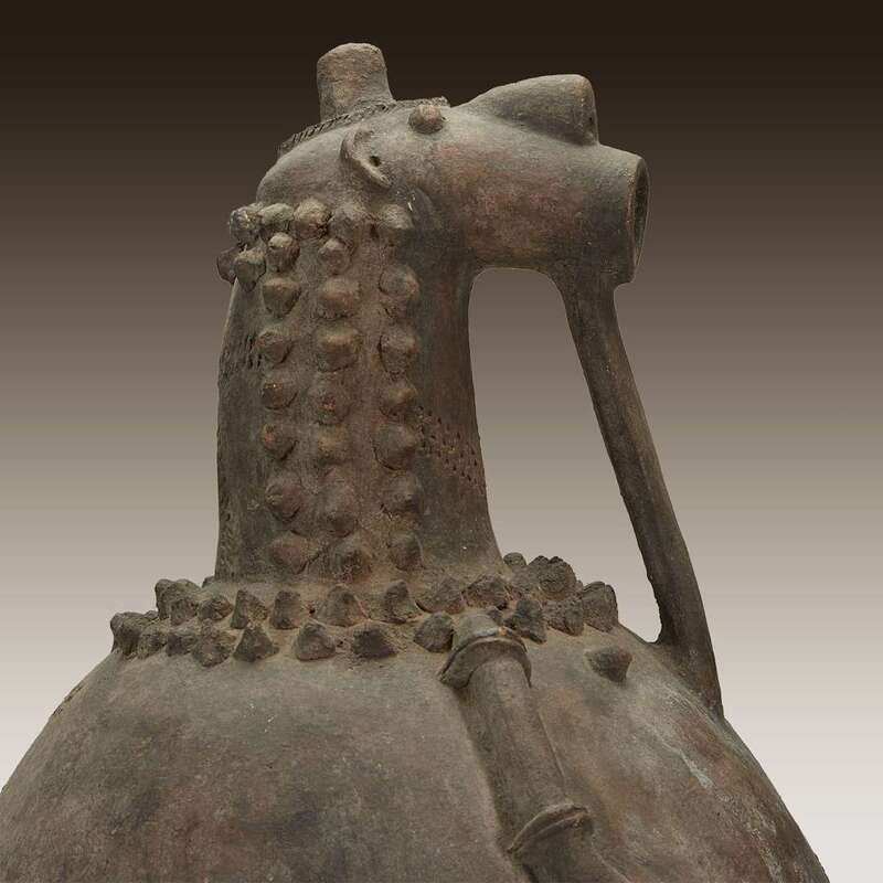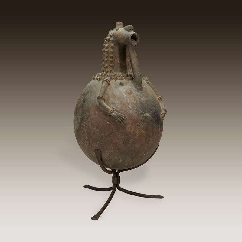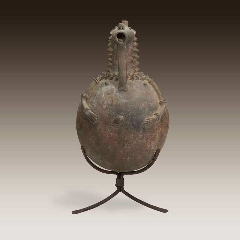 Fired terracotta, standing on a rounded base, the squat body with scarification running in a cross from the navel, the arms reaching down to the midriff, with applied terracotta beads around the upper chest and neck, shown bearded, with the mouth open and extending forward in a tube-like protuberance, with a tripod mount.