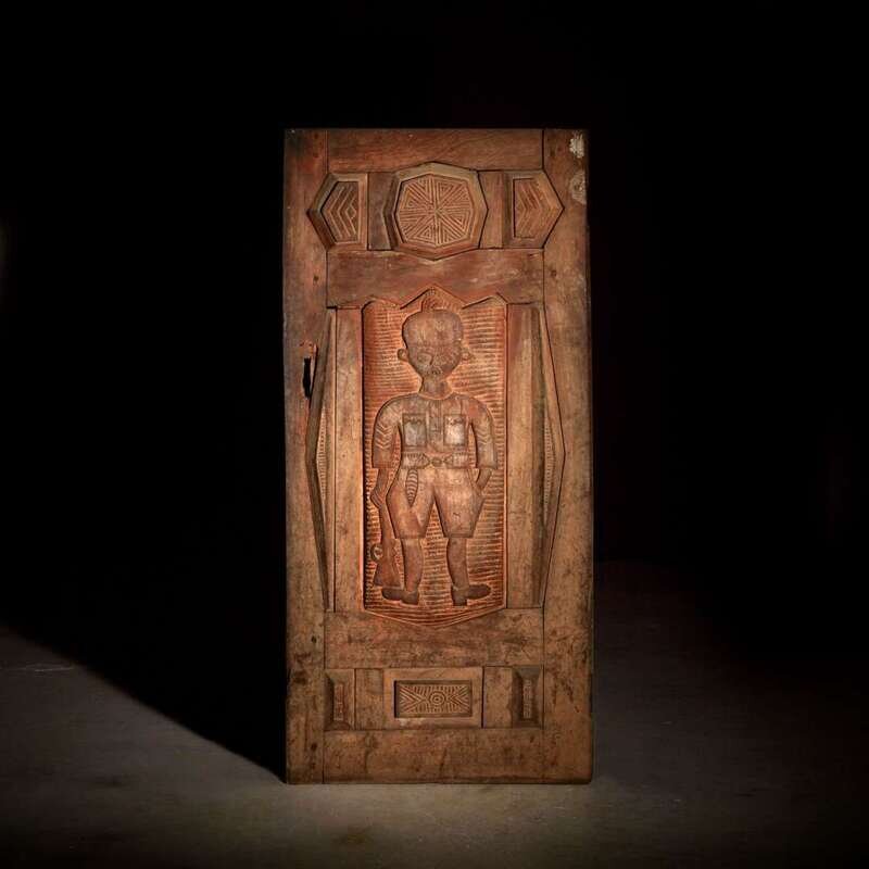 Carved wood, with a central depiction of a colonial era soldier in low relief.