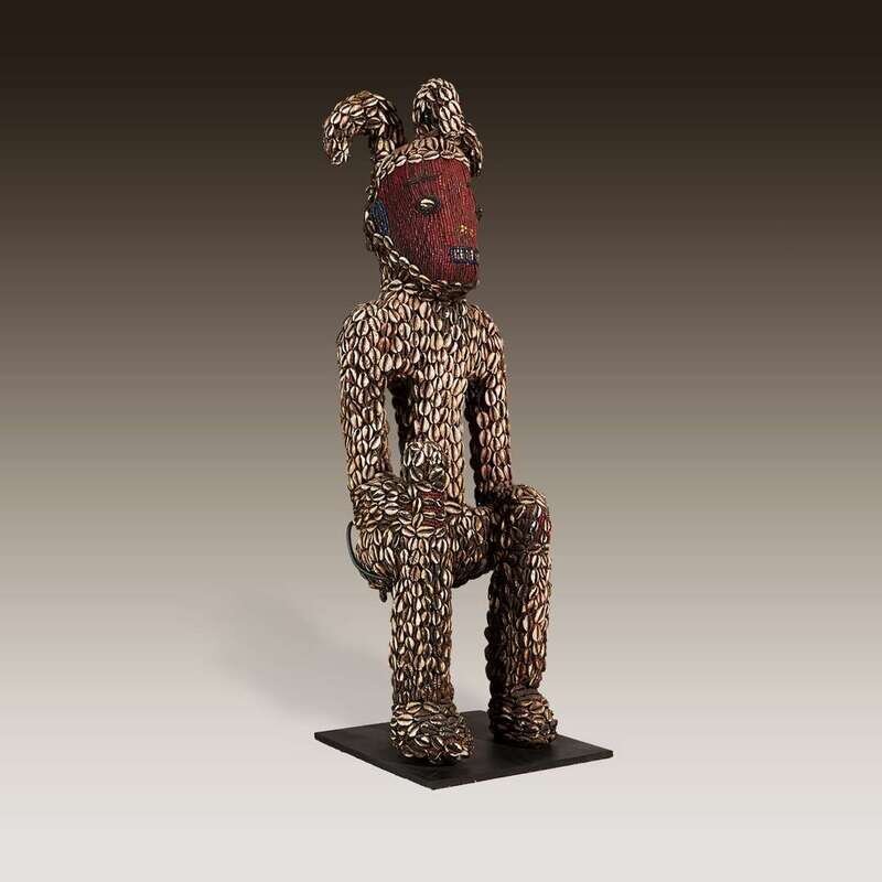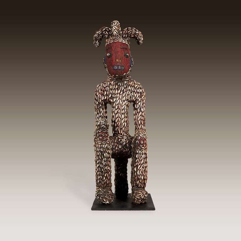 Formed of a wooden base with beadwork and cowrie shells woven into a fabric skin, the figure shown seated on a stool, with the hands placed on the knees, looking straight ahead, displaying an elaborate coiffure.
