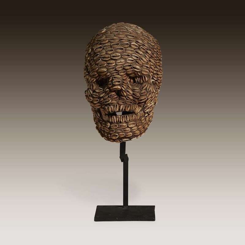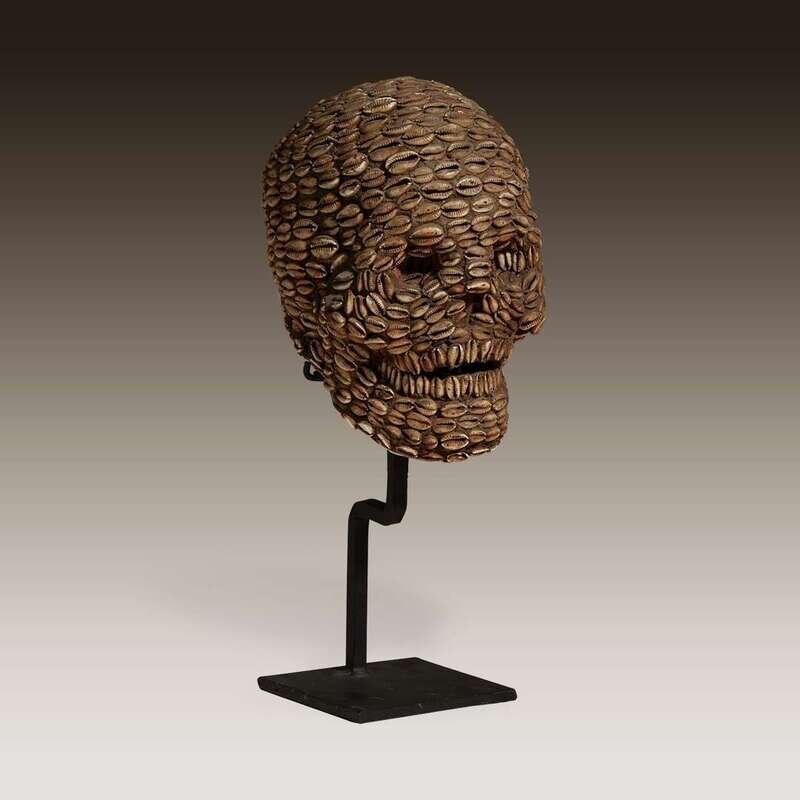 Carved wood and cowrie shell, modelled in the form of a small human skull and entirely covered in cowrie shells, raised on a bespoke mount.