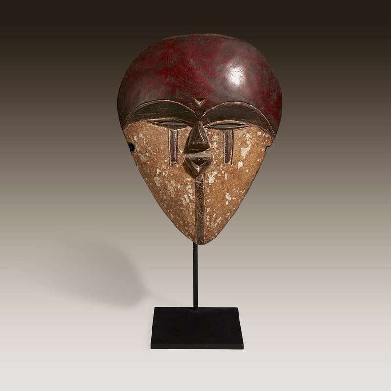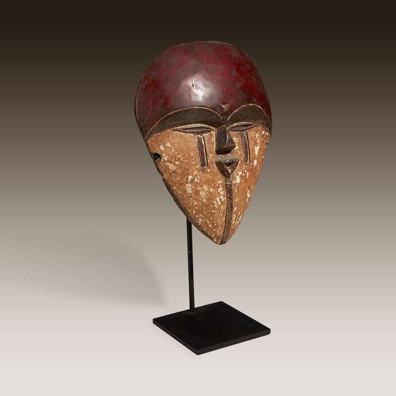 Carved wood and pigment, the domed forehead above a recessed brow, the slit eyes, triangular nose and mouth placed in close proximity at the center, scarification marks run vertically down the lower half of the face, bichrome pigment of cherry and dark cream, raised on a bespoke mount.