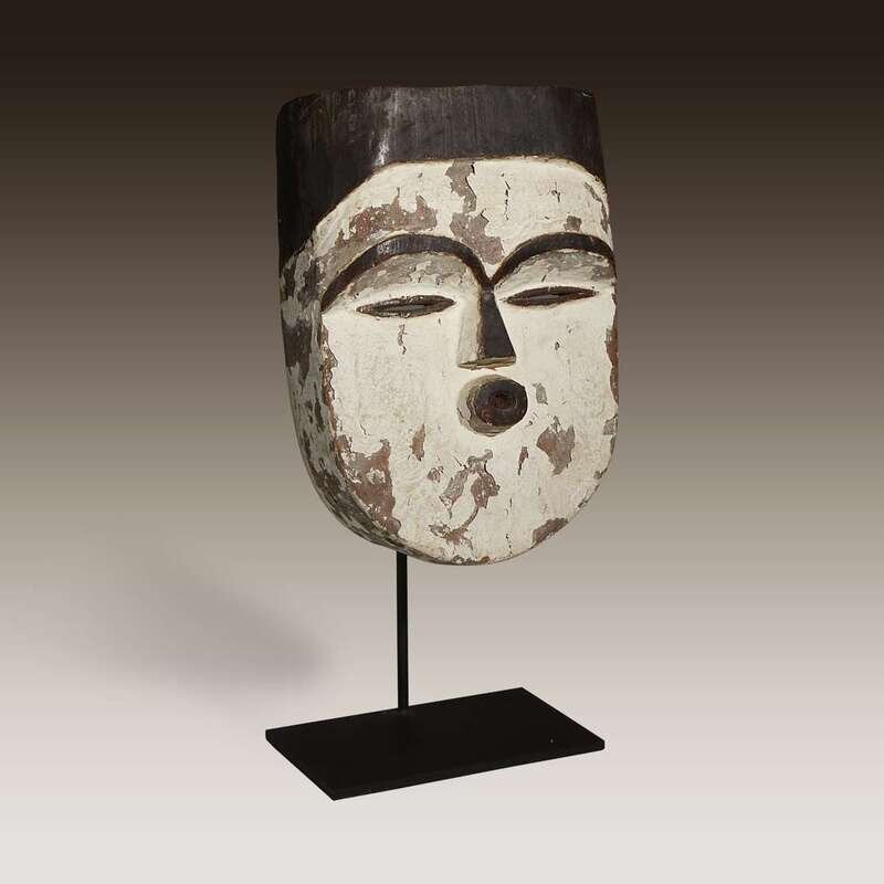 Carved wood and kaolin, arched brows meeting in the center at a triangular nose above a circular mouth, the eyes reduced to thin slits, with a painted black coiffure and face coated in kaolin, raised on a bespoke mount.