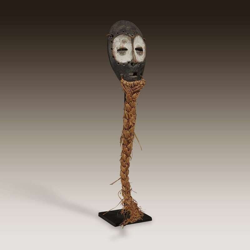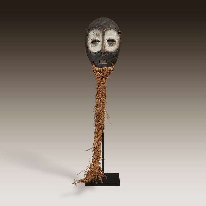 Carved wood and raffia, carved wood and plant fiber, with slit eyes, long nose and an open mouth, the mid-section colored with kaolin, a beard of plant fibers hanging below, raised on a bespoke mount.