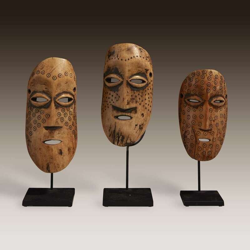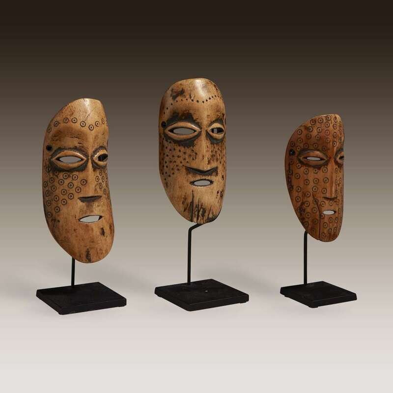 Of elliptical form, with coffee bean eyes, slit nose and a small perforation for the mouth, decorated with incised circles and dots, raised on bespoke mounts. (3).