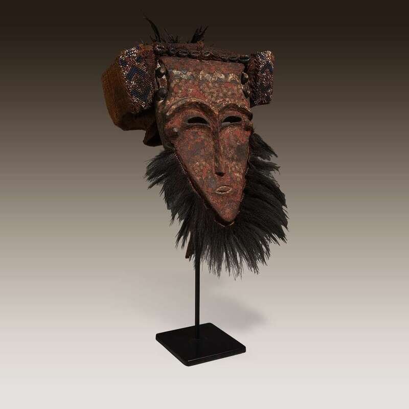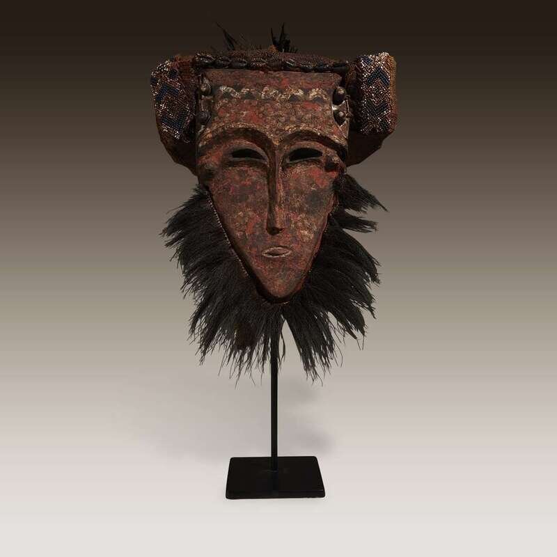 Carved wood, pigment, beadwork, hair and feathers, the face on a flat plane with a raised ridge denoting the brow and nose, with an animal hair beard below the jaw and elaborate feather and bead headdress above, raised on a bespoke mount.