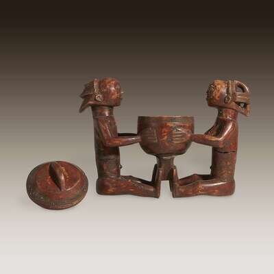 Carved wood, the male and female figures shown seated and facing one another holding a central bowl with separate lid.