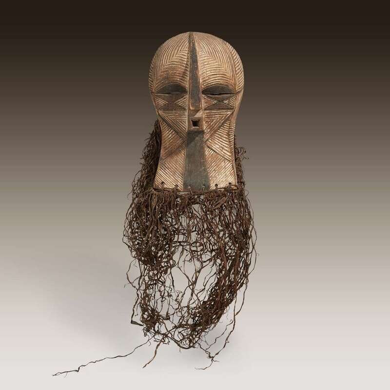 Carved wood and pigment, the domed forehead above pierced coffee bean eyes and an extended square mouth, the face covered in criss-crossing grooves and colored with kaolin.