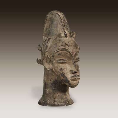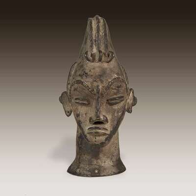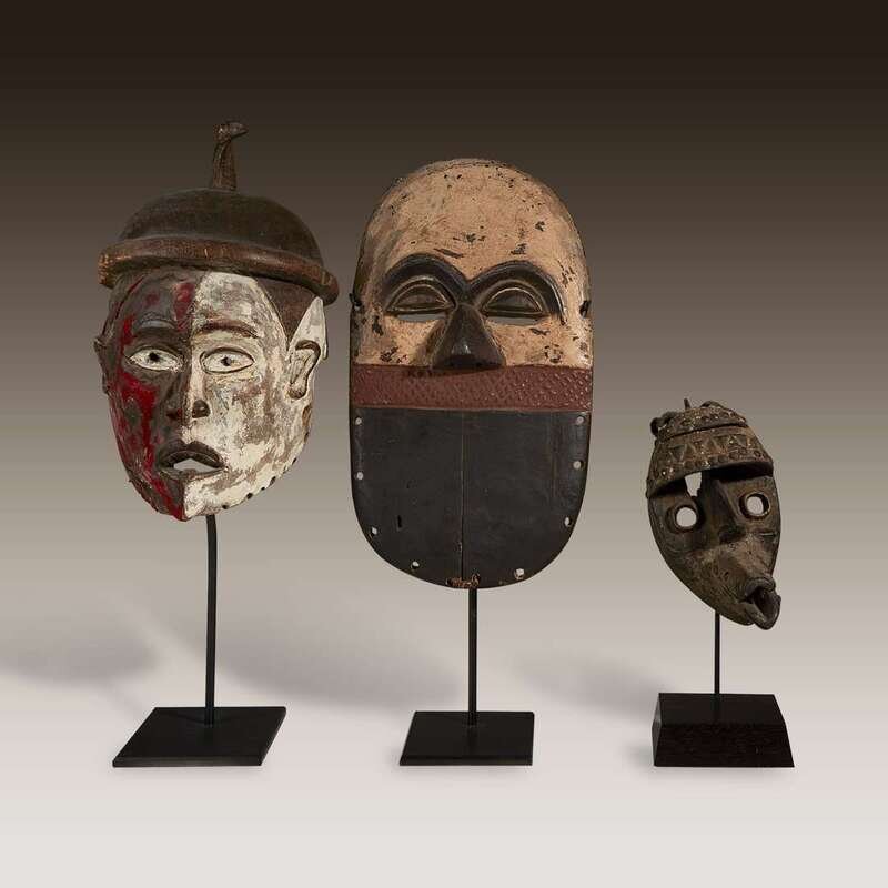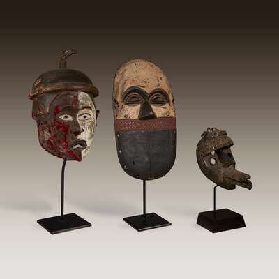 Comprising a Kongo mask, the mouth open, the nose broad and prominent, the eyes pieced at the center, the face painted in two-hued white and red split vertically down the front, shown wearing a bowler hat, raised on a bespoke mount; a Guere mask raised on a bespoke mount; an Mbole style mask raised on a bespoke mount; a Nigerian Ekoi style cast bronze headdress; and contemporary Central African mask. (5).
