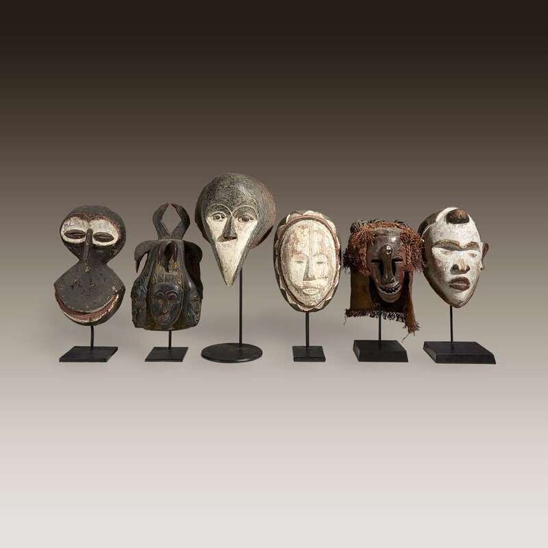 Carved wood, comprising; a Cameroonian basketwork and carved wood headdress of a bird, a Fang adouma mask, a Ligbi janus mask, a Hemba mask, a Punu mask, and a Congolese mask. (6).