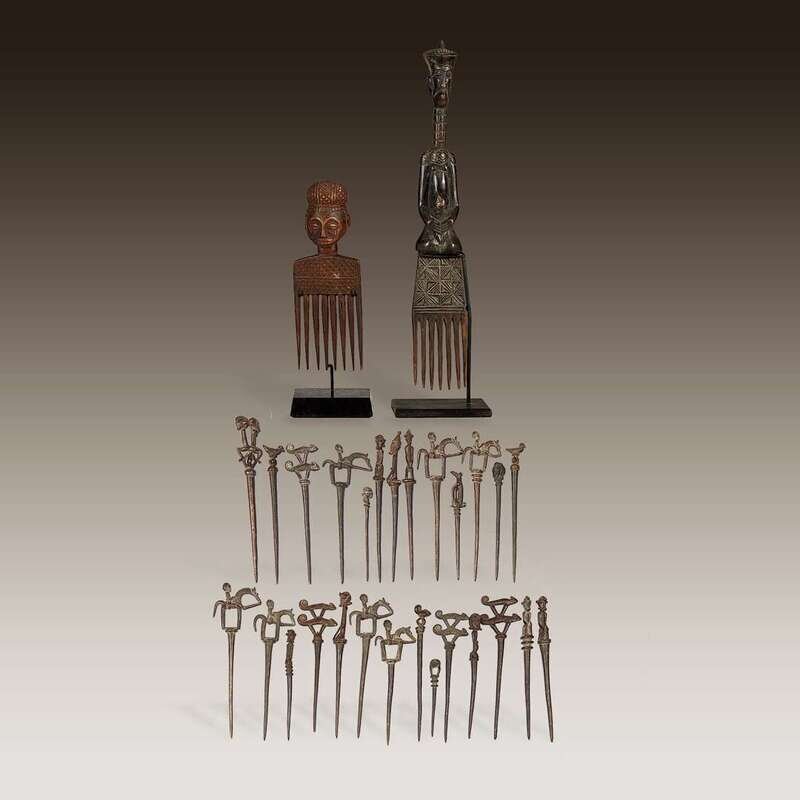 Comprising a Kuba Lele comb with fine teeth, hatched decoration and a seated human finial, raised on a bespoke mount; a Chokwe comb with human head finial, raised on a bespoke mount; twenty-seven Akan bronze hair pins with a variety of anthropomorphic and zoomorphic finials. (29).