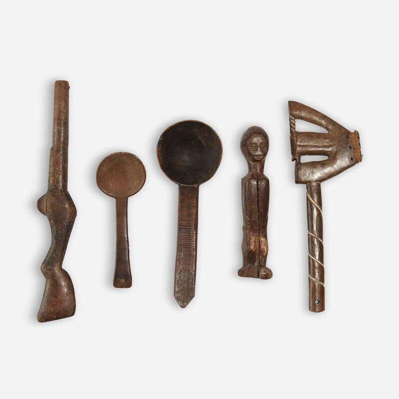 Comprising a pair of Nguni spoons, a Southern African rifle model and an East African figure; the spoons painted with inventory numbers '1763' and '1764.' (5).