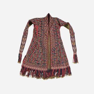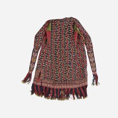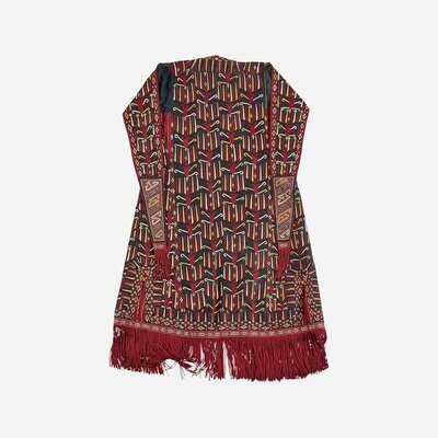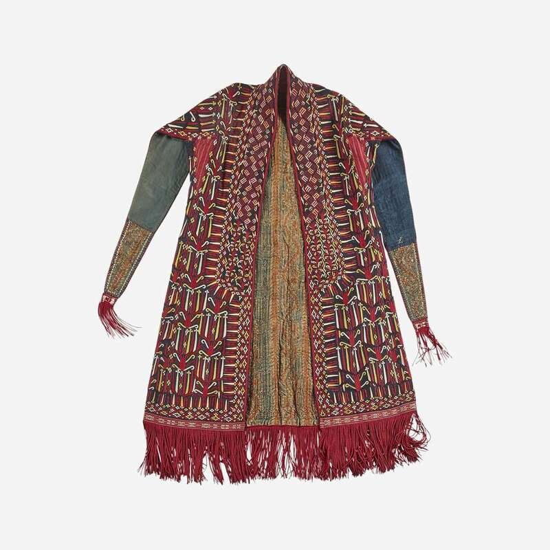 Embroidered cotton, dark blue ground with stylized geometric and floral motifs in red, yellow, white, and black. (2).