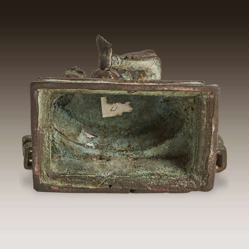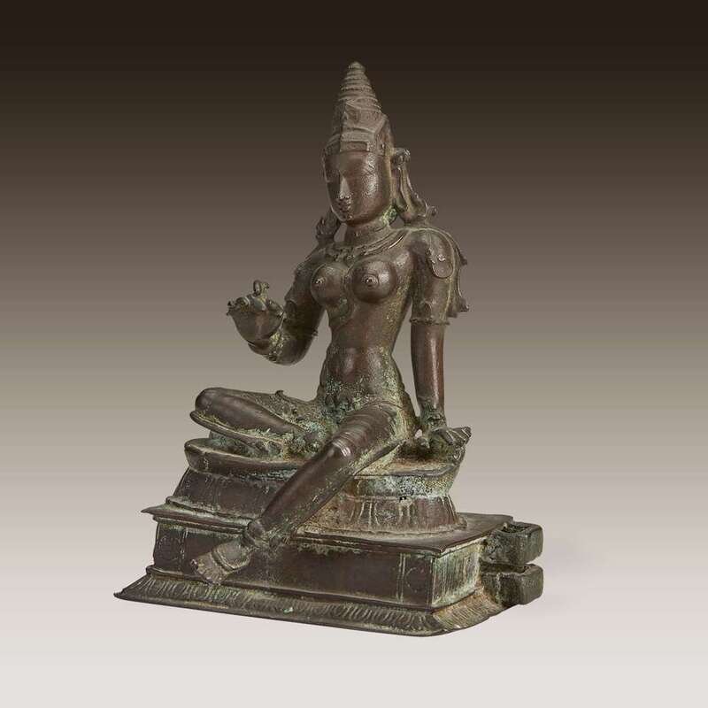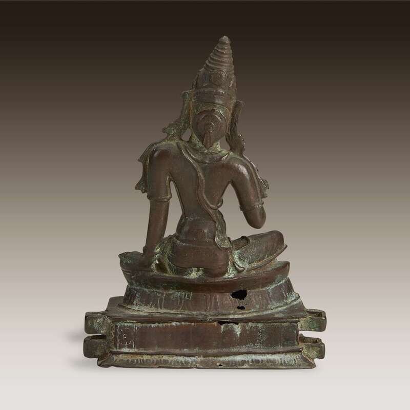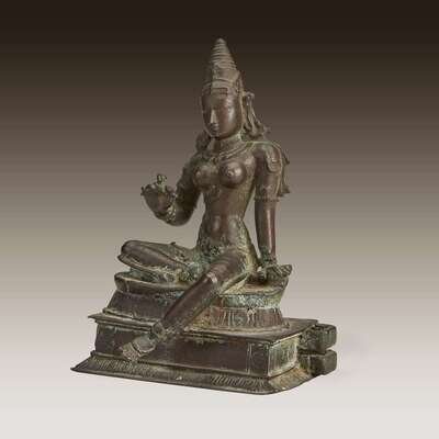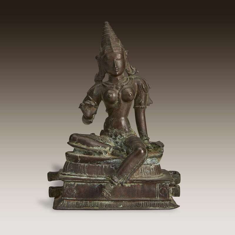 The elegant goddess seated, with one hand raised, in lalitasana atop an oval of lotus petals and rectangular stepped plinth, brown patina with areas of verdigris.