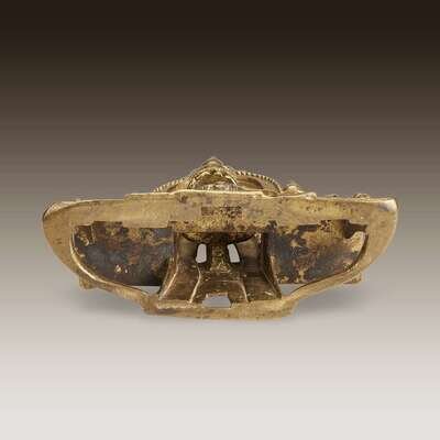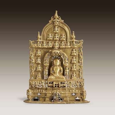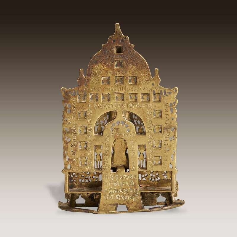 The central figure under an openwork canopy and on stepped base, within an arched surround and a series of seated figures, the back with extensive inscription, polished golden patina.