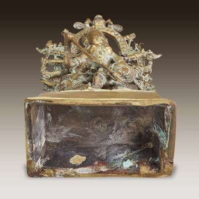 The goddess and her lion slaying the demon, in front of an arched surround, polished golden surface.
