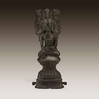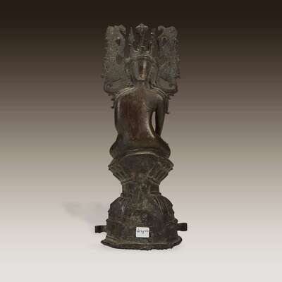 Depicted seated in bhumisparsha mudra, adorned with an elaborate crown with pierced streamers, seated atop a stepped lotus pedestal, lacking adorants.