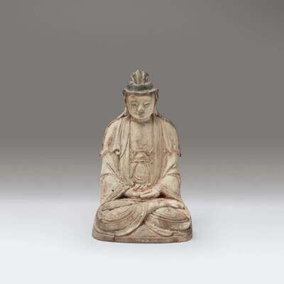 Delicately carved, in flowing robes, seated in dhyanasana mudra, traces of pigment and gilding.
