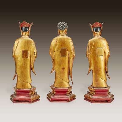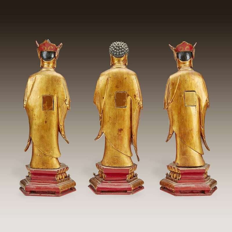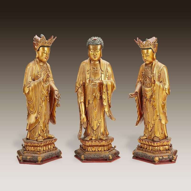 Comprising the Buddha standing, and a pair of crowned standing bodhisattva, all on pedestal bases. (3).