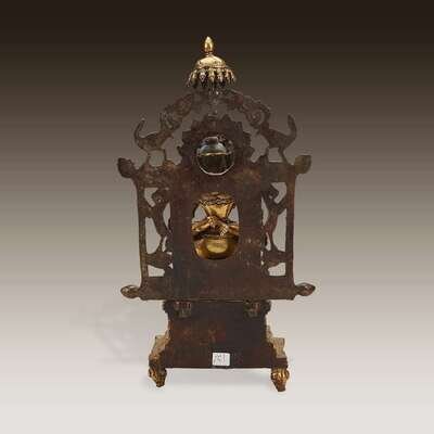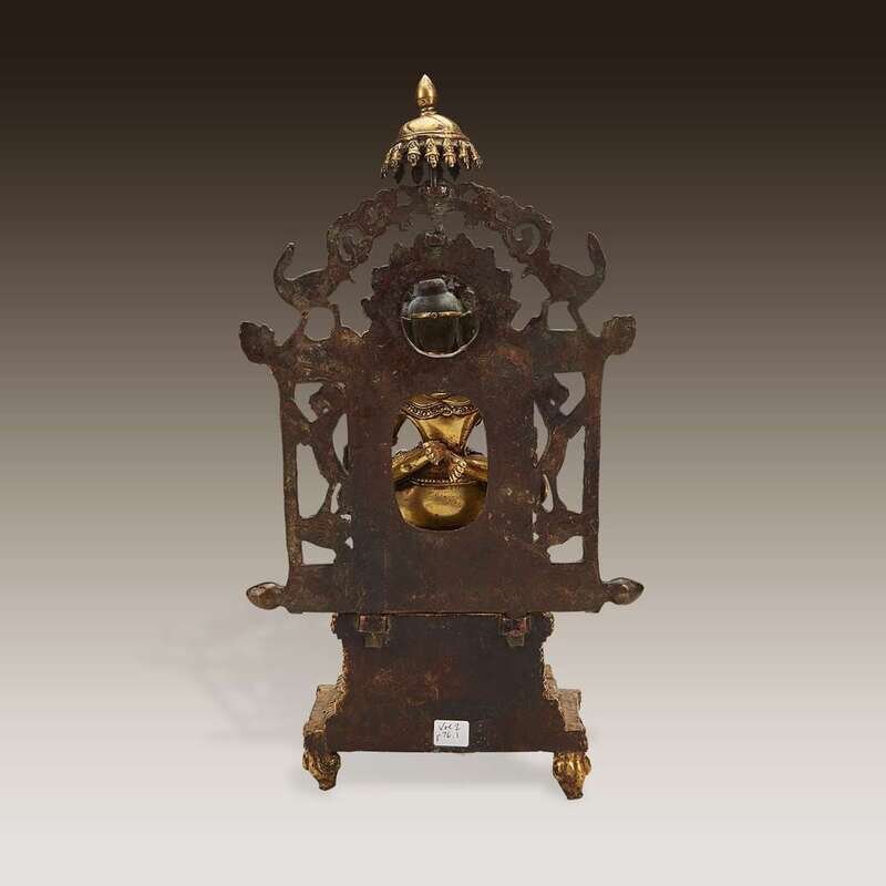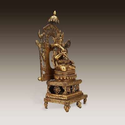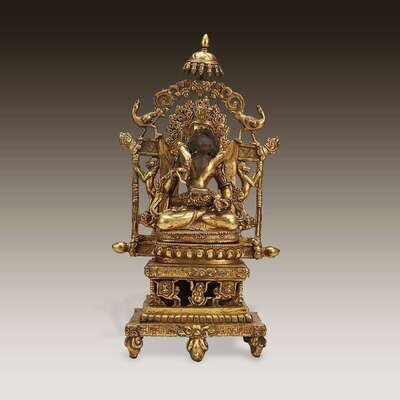 The central figures in yab-yum on a lotus platform, seated upon a pierced throne beneath a detachable umbrella and pierced aureole decorated with lions and geese, Vajrasattva bearing a ganta and vajra in each hand, the throne raised on five scrolling feet.