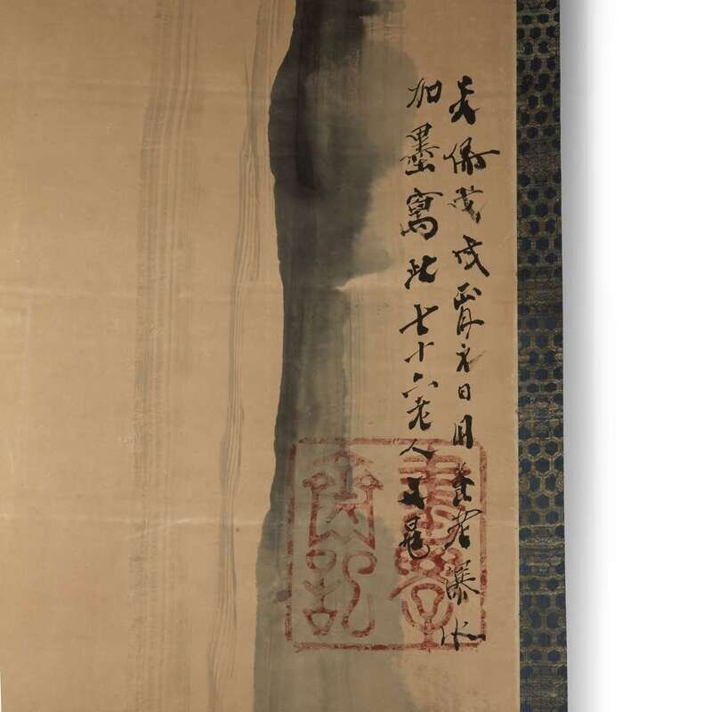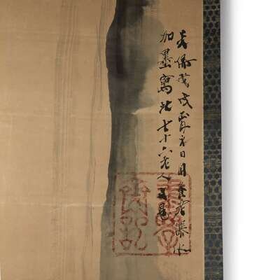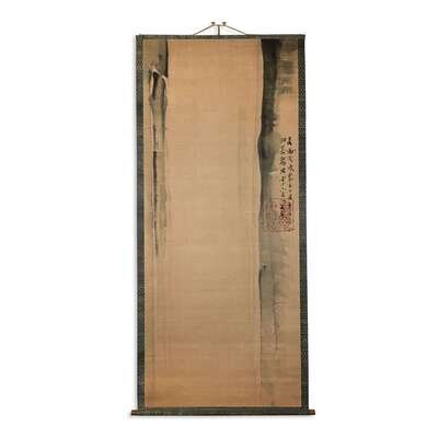 Ink on paper, inscribed, with a cyclical date equivalent to 1838, and with one seal, center right, mounted as a hanging scroll, Japanese wood roller-case and two Japanese wood boxes.