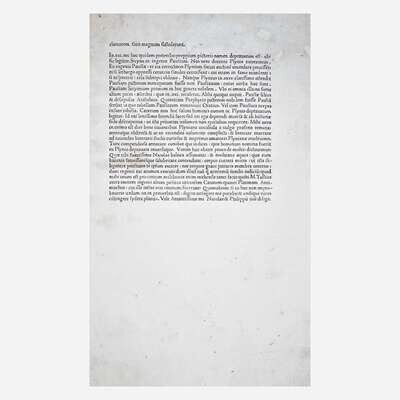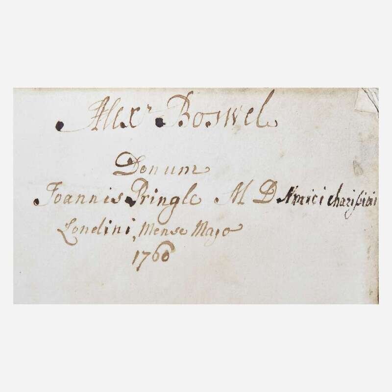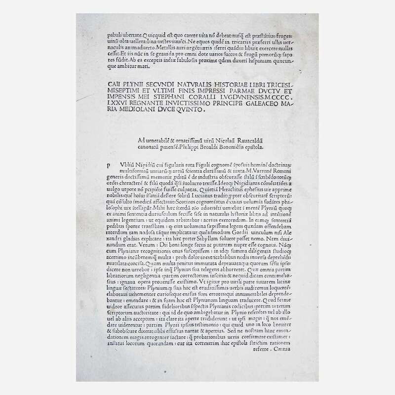 Parma: Stephanus Corallus, 1476. Edited by Philippus Beroaldus. Folio (422 x 279 mm). 356 (of 358) leaves, lacking first two printed leaves; front and rear blanks presumably eighteenth century. 50 lines, single column (table at front in single and double columns). Roman type (type: 1:111R). Initial spaces largely blank and unrubricated; initials on leaf 3r and 180r painted in, presumably in a later hand, some spaces with later paper initials pasted down. Full contemporary doeskin, heavily rubbed and worn, some portions of raised bands exposed; front hinge starting, repair in top left corner of front free endpaper; first printed leaf soiled and moderately darkened; leaves 2 and 3 moderately soiled; leaf 14 repaired in upper gutter; bottom 4 inches of margin in leaves 86-90, 126-134, 154-173, 195-216, and 227-240 replaced, presumably at same time as blanks; light to moderate dampstaining at lower fore-edge and bottom corner of final 132 leaves; scattered light to moderate spotting and soiling throughout entire volume; scattered marginalia; old catalogue description of this copy on front paste-down. Presentation copy from Sir John Pringle to Alexander Boswell (father of Johnson biographer James Boswell): "Alexr Boswel/Donum/Joannis Pringle MD Amici.../Londini.../1760". Ownership inscription of the Rev. Dr. Jeremiah Zimmerman on front paste-down. ISTC ip00790000; Goff P790; BMC VII 939; GW M34300. Pliny the Elder's monumental encyclopedia of ancient knowledge, his only surviving work. Stephanus Corallus was the second printer to operate in Parma, and only 15 works are known to have been printed by him. Only three other copies of this work have come to auction in the past 100 years. Rare. Alexander Boswell, Lord Auchinleck (1706-82) was a judge on the supreme court in Scotland, and father of Samuel Johnson biographer James Boswell. He was lifelong friends with British physician Sir John Pringle, 1st Baronet (1707-82), who is often considered the "father of military medicine". Pringle was appointed physician-general to the Low Countires in 1744, and in 1752 published "Observations on the Diseases of the Army", a groundbreaking work of modern military medicine. Pringle often acted as intermediary during Alexander and James' tumultuous relationship.