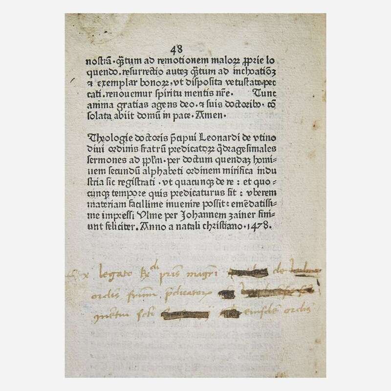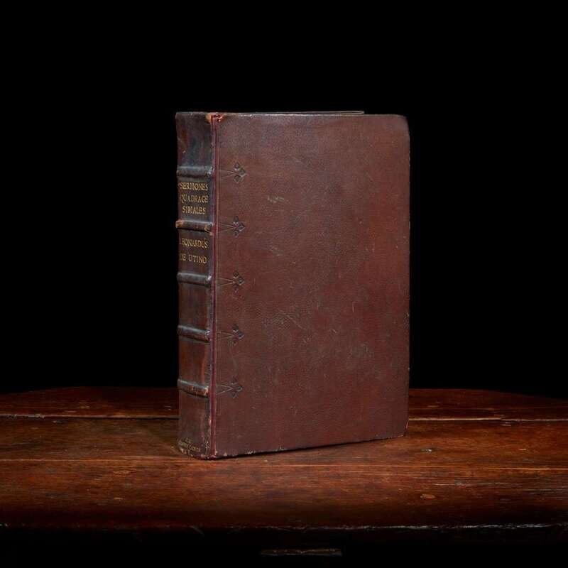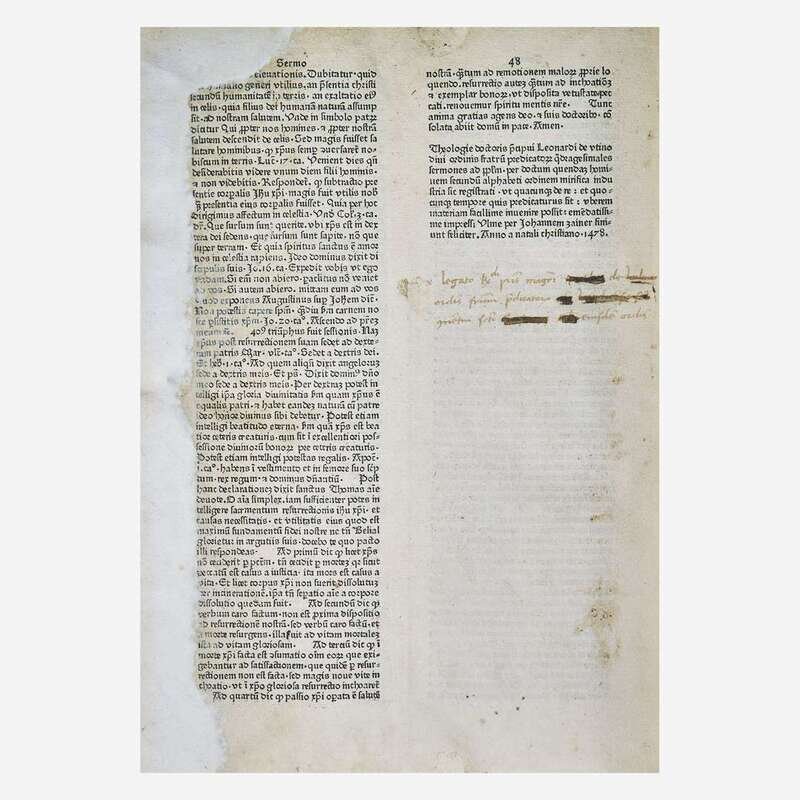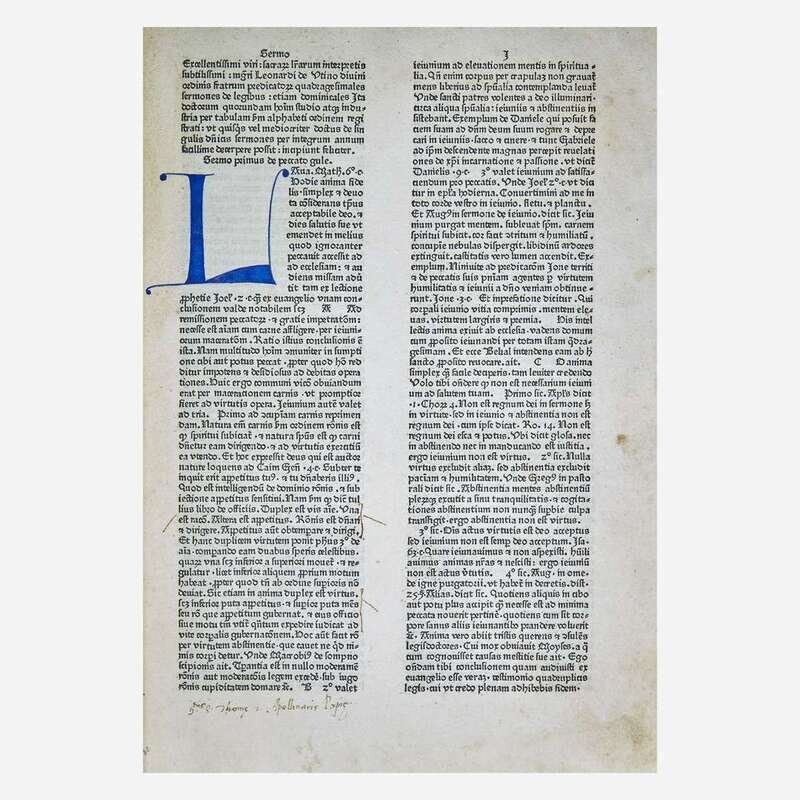 Ulm: Johann Zainer, 9 Mar. 1478. Folio (352 x 254 mm). 380 leaves, plus additional leaf bound in at front with lengthy inscription. 60 lines, double column. Gothic type. Initials rubricated in red and blue ink, some intials in later text blank. Early twentieth century (1902) full pigskin, stamped in blind and in gilt, rebacked, boards rubbed and scratched, spine ends and raised bands rubbed, extremities lightly worn; first leaf repaired along top and fore-edge; top corner of first three leaves restored with later paper, some loss to text; small circular excision at bottom edge of 13th leaf; scattered soiling and spotting in margins of most leaves; scattered marginalia; repairs along top and fore-edge of final 11 leaves; 3 1/4 in. portion of fore-edge of final leaf excised; book-plate of author Herbert S. Squance (1905) on front-paste-down; ownership signature of Jeremiah Zimmerman on front paste-down. ISTC il00146000; Goff L146; BMC II 525; GW M17922. Leonardus de Utino (1400-70) was a Dominican monk and follower of Thomas Aquinas. During his lifetime he was one of the most popular and influential preachers, teaching in Bologna and throughout Northern Italy. Only one other copy in the auction redcord (1979).