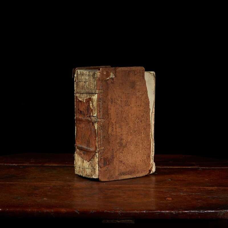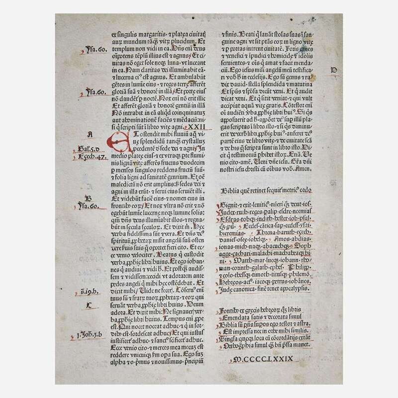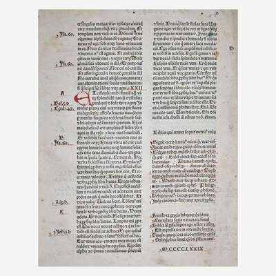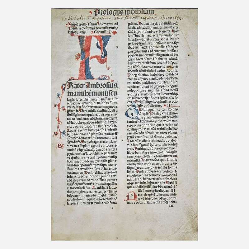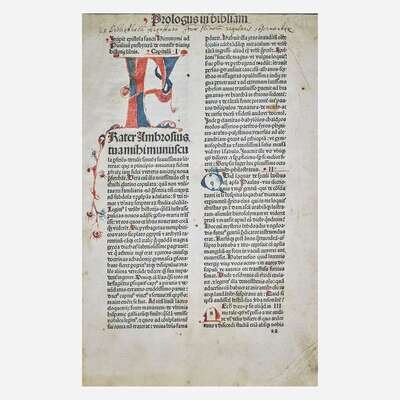 Basel: Johann Amerbach, 1479. Folio (279 x 203 mm). 538 leaves. Collation: a-y10, A-T10, U12, X-Y10, 1-8(10), 9-10(8). 47 lines, double column, headlines, X2v-10(8)r with printed sidenotes. Gothic type (type: 1:185G, 2:81G, 3:92G). Initials rubricated in red and blue throughout entire volume. Original wooden boards, leather almost entirely perished, front and rear board fore-edges severely chipped, worming and heavy wear to same, spine partially perished but sound; text leaves trimmed with some headlines partially shaved; scattered marginalia; varying degrees of dampstaining along bottom edge and at upper gutter and top edge of most leaves; some initials faded; soiling and dampstaining to front paste-down and first two leaves; creasing and short closed tears along fore-edge of first 31 leaves; b1 sprung; small loss at bottom corner of i6; P5-P6 fore-edge cut away but with no loss to text. Book-plate of Theological Seminary Library, Gettysburg, Pa., as well as donation book-plate of the Rev. Jeremiah Zimmerman on front paste-down. ISTC ib00561000; Goff B561; BMC III 745; GW 4236; VcBA 11002911. "The glory of Basel started when Johann Amerbach (1443-1513) set up his press in 1477. A pupil of Johann Heynlin at the Sorbonne, where he obtained his degree as Master of Arts, Amerbach made the press the vehicle of the Christian humanism of his teacher. A scholar and aesthete himself, he saw to it that his editions were not only printed with fastidious taste but also edited with care and accuracy." (p. 48, Steinberg. "Five Hundred Years of Printing") Amerbach's first Bible to include the marginal concordance system in the New Testament, which enabled easier reference to biblical passages; it had first appeared in printed form in Basel printer Bernhard Richel's Bible of 1477. Only five copies of Amerbach's first Bible appear in the auction record. Rare.