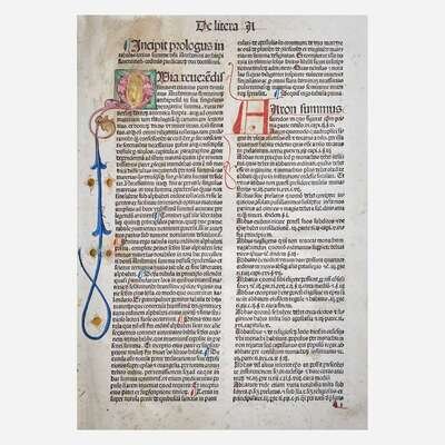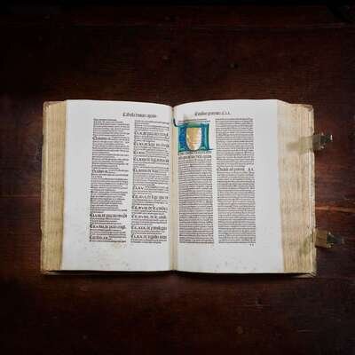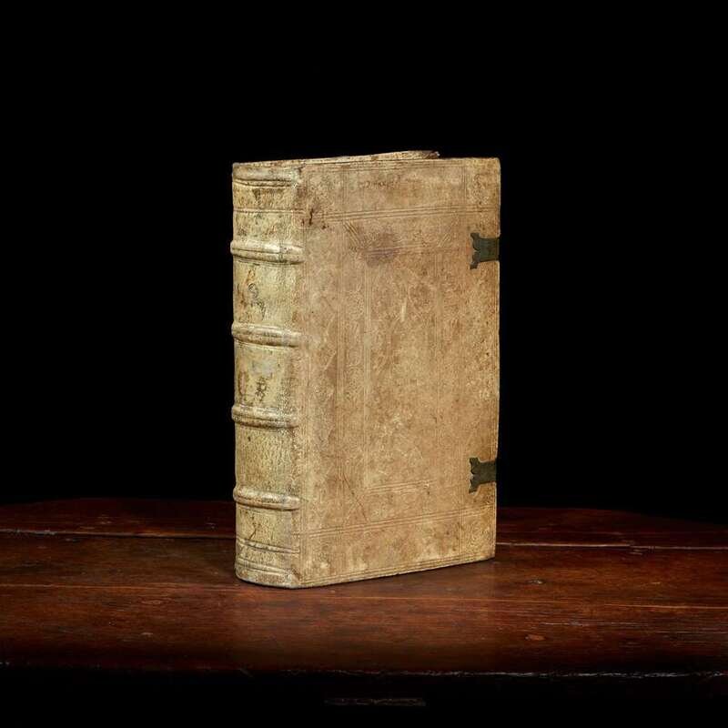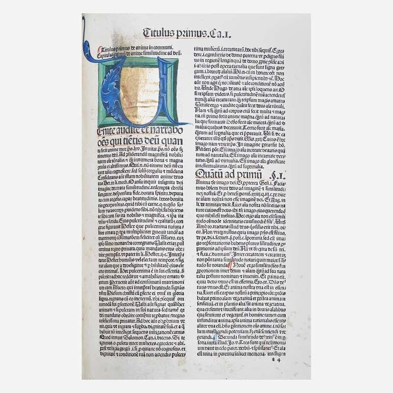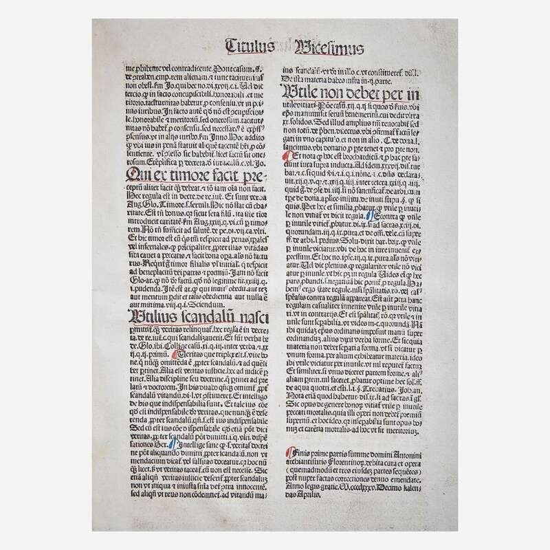 Basel: Michael Wenssler, 1485. Part one only. Index of Johannes Molitoris at front. Folio (349 x 241 mm). 374 leaves. Collation: A-P8, [2], Q8, [2], a-z8, (?-?8), A-C8, D6, E-F8. 56 lines, double column, headlines. Gothic type (type: 4:190G, 9:90G). Initials rubricated in red and blue ink, with illuminated initials at leaf A2 and a4. Near-contemporary full pigskin over wooden boards, elaborately stamped in blind, rubbed and soiled; tooled brass and pigskin clasps and catches intact and unsophisticated; scattered minor spotting and soiling to text; scattered marginalia; short tide mark at bottom of most leaves (more pronounced from leaves l8 onward); closed tear at top corner of M6; approximately 2 1/2 in. open tear at fore-edge of M8; faint dampstaining on leaf r1; old ownership signature at bottom of E3 at rear and dated 1659, 1 1/4 in. chip at bottom edge of same; dampstaining at top corner of F4-F8 at rear; two small open tears at bottom corner of F8 at rear; old cataloguer's notes on title-page, rubber stamp of seminary on title-page, bottom margin A2, F8v at rear, and rear paste-down; book-plate of Theological Seminary Library, Gettysburg, Pa., as well as donation book-plate of the Rev. Jeremiah Zimmerman on front paste-down. ISTC ia00874000; Goff A874; BMC III 728; GW 2188. Antoninus of Florence (1389-1459) was an Italian Dominican friar who ruled as Archbishop of Florence from 1446 until his death. He was canonized on May 31, 1523 by Pope Adrian VI. Michael Wenssler (14??-1499) was a Basel based printer. Born in Strasbourg, he became a citizen of Basel in 1473 and printed there until 1490. He sold his printing press in 1490 to settle debts, and worked briefly in France, returning to Basel in 1499.