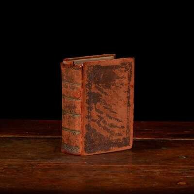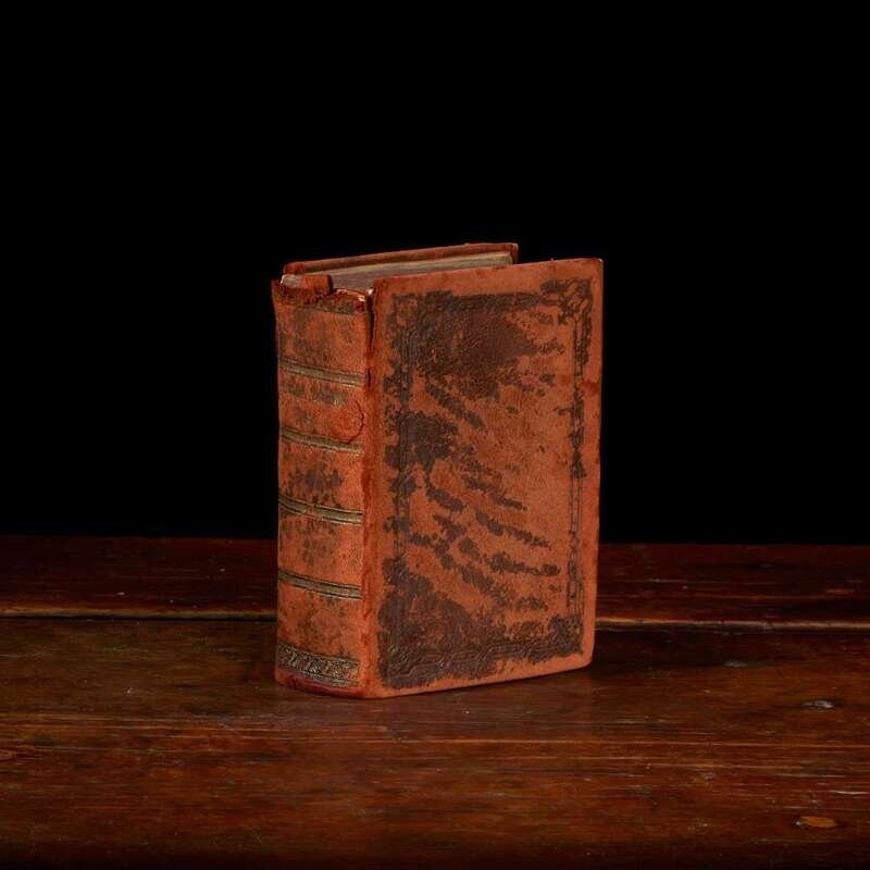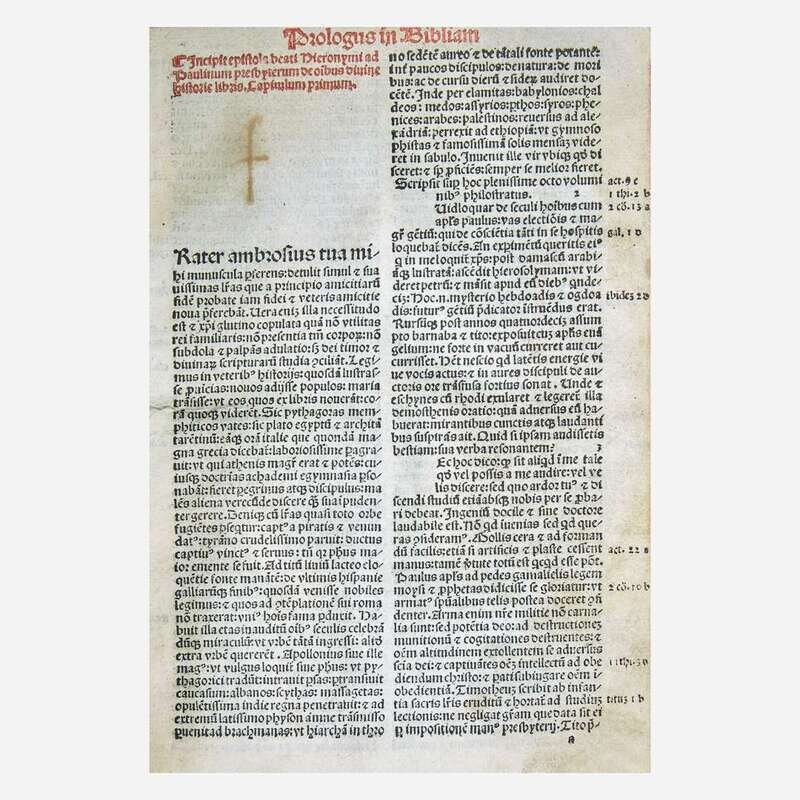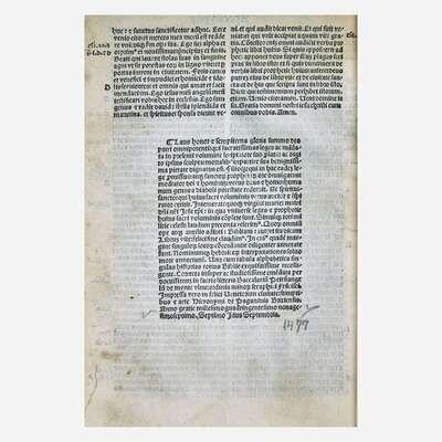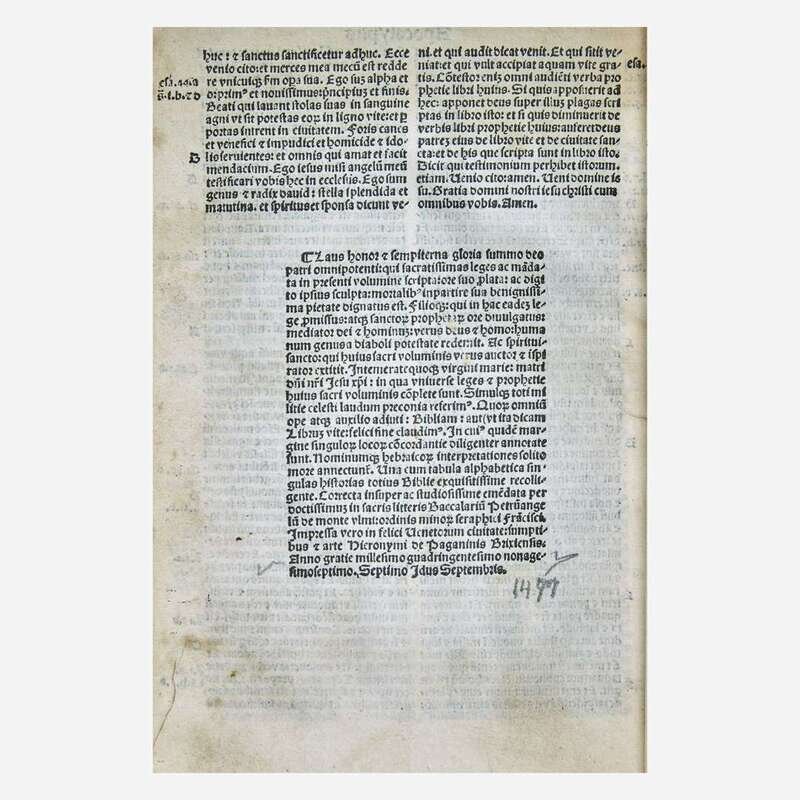 Venice: Hieronymus de Paganinis, 7 Sept. 1497. Edited by Petrus Angelus de Monte Ulmi. 8vo (165 x 120 mm). 511 (of 514) leaves. Collation: A10, a8, b7, c-z8, [et]8, [con]8, [rum]8, 2a-2m8, 2n10, 2o8- 2z8, [2et]8, [2con]8, [2rum]8, A-F8, 1-4(8), 5(5); lacking first leaf (title-page), b8, and final leaf (printed title-page supplied). Gabriel Brunus table: 50 lines, double column, headlines; text: 54 lines, double column, headlines (rectos only); "Interpretationes": 54 lines, three columns, headlines (rectos only). Gothic type (type: 7:52G, 8:89G, 9:45G, 10:90R). Headline and first paragraph on leaf a1r printed in red, initial spaces largely blank, a few filled in with faint ink guides; printed side-notes and shoulder-notes. Full brown calf, stamped in blind and in gilt, heavily rubbed, chipping at head and tail of spine, upper rear joint starting; title inscribed on fore-edge; some headlines shaved close; scattered minor worming; scattered marginalia; minor to moderate darkening and spotting in margins; dampstaining at bottom edge of g8-h1r; scattered subtle dampstaining in margins; old inscription on F8r; dampstaining in fore-edge of 1-4(8) and 5(5); final two leaves repaired in upper gutter; last leaf chipped at bottom corner with a few letters lost. Book-plate of the Doctor Jeremiah Zimmerman Library, Lutheran Theological Seminary, Gettysburg, Pa., on front paste-down. ISTC ib00601000; Goff B601; BMC V 459; GW 4278. In 1492 Hieronymus de Paganinis published the second octavo Latin bible, and this reprint was printed five years later.