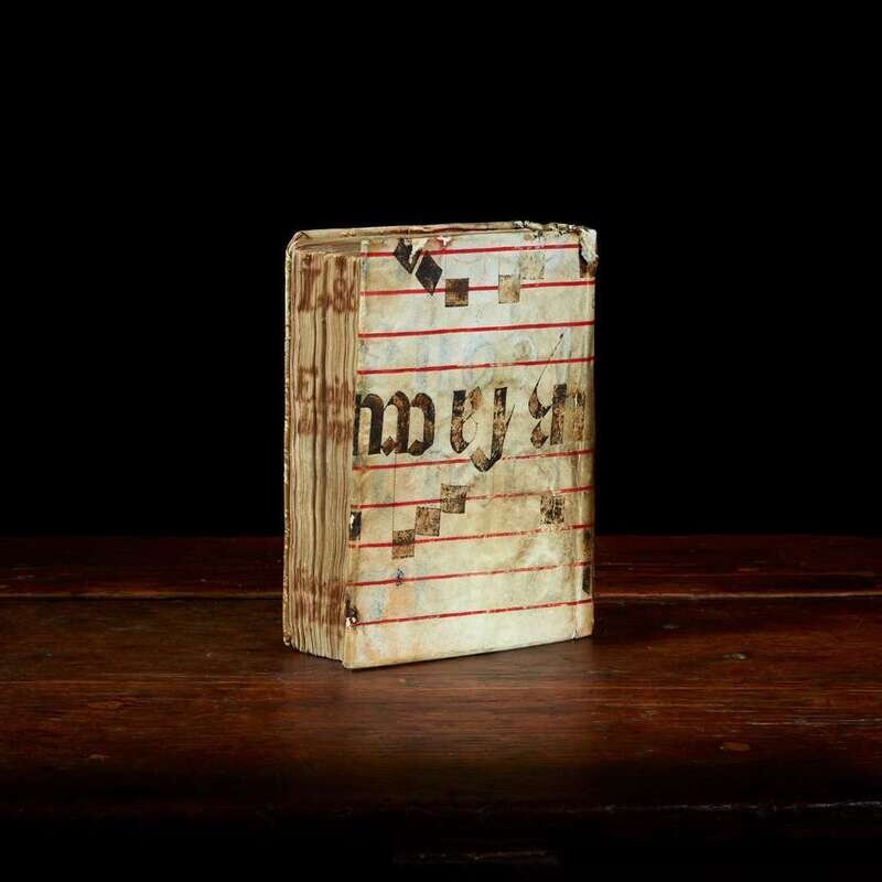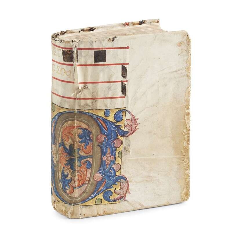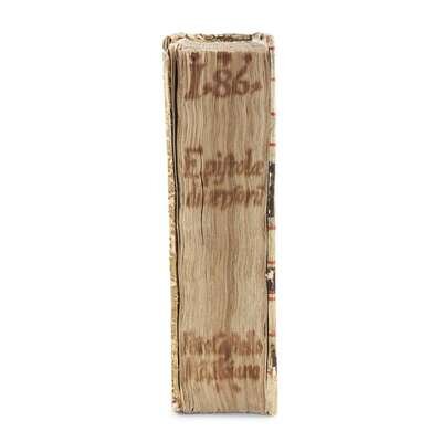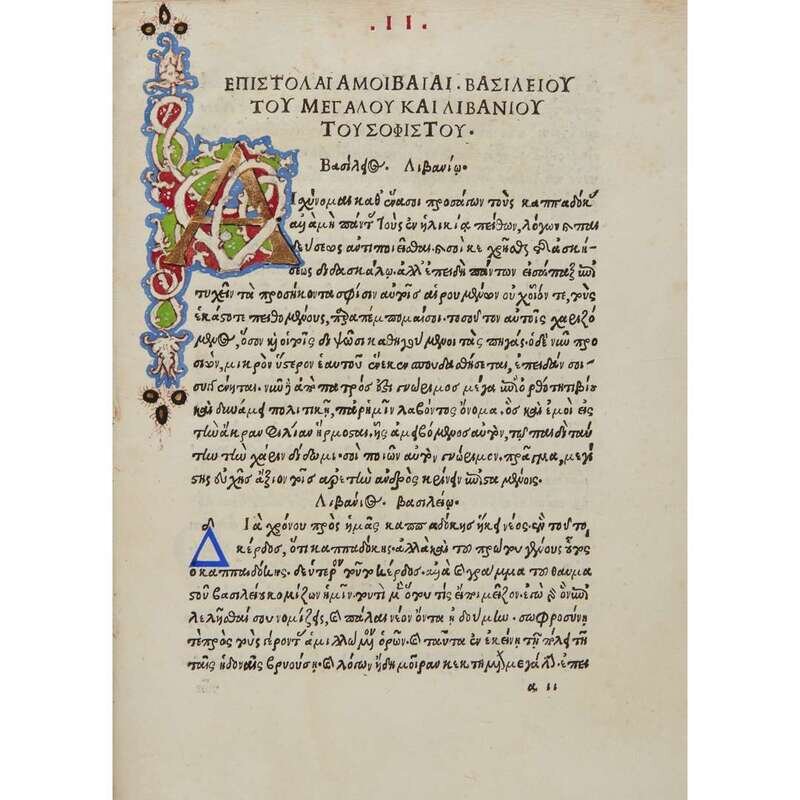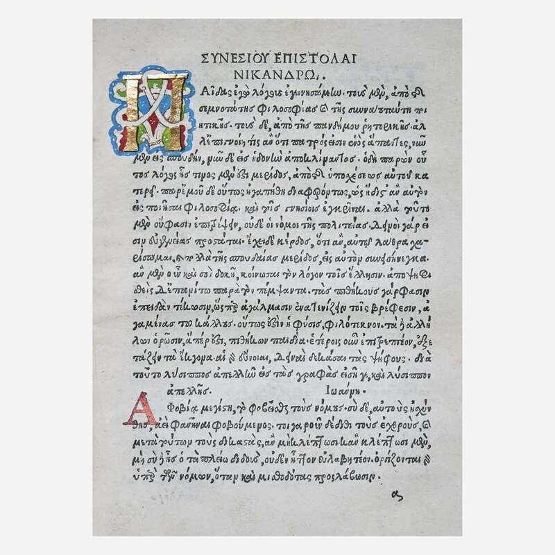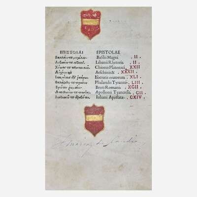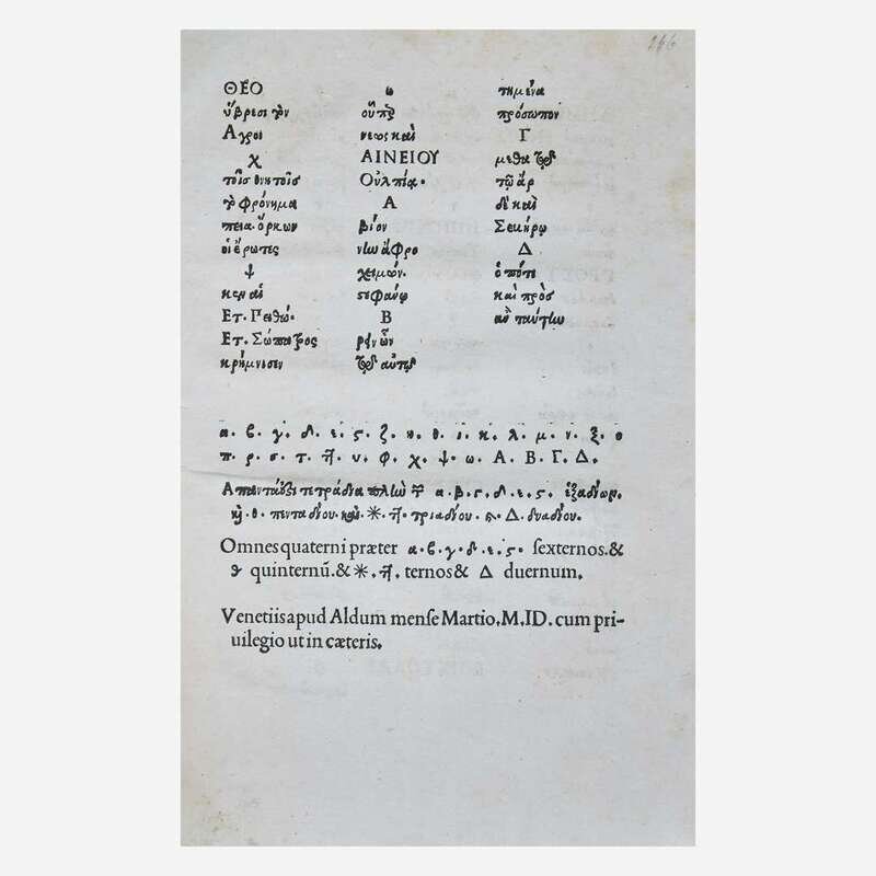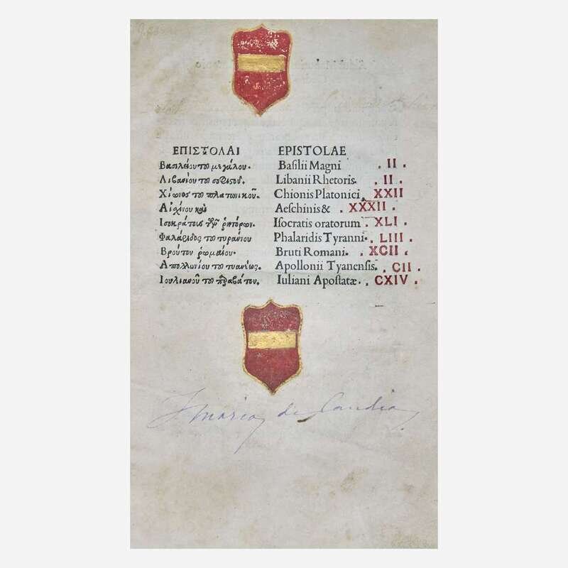 Venice: Aldus Manutius, March-April, 1499. Edited by Marcus Musurus. 4to (215 x 152 mm). Two parts in one (bound in reverse order, beginning with Part II). Part II: "Epistolae". 136 (of 138) leaves, lacking leaves sigma3-4. Collation: alpha-epsilon8, zeta-eta6, theta-rho8, sigma6. 26 lines, single column, printed catchwords. Roman type (colophon, title, prelims: 2:114R, text: 7:114Gr). Illuminated initials, other initials printed in red and blue; printed and MS foliation in top margin. Part I: "Epistolae diversorum philosophorum, oratorum...". 258 (of 266) leaves, lacking gamma8 at rear. Collation: alpha-epsilon12, digamma12, zeta-eta8, theta10, iota-tau8, 2tau6, upsilon-omega8, Alpha-Beta8, Delta4; leaf 85 blank. 25 lines, single column, printed catchwords. Type same as above. Illuminated initials, other initials printed in red and blue. Bound in ca. fifteenth century antiphonal leaf with large illuminated "D", titled in Greek in gilt on spine, recased, front board fore-edge worn, top front joint worn, some wear to spine ends, scattered soiling; title in MS on fore-edge of text; endpapers renewed; two unidentified coats of arms painted on title-page of part II, ownership signature of Maria de Candia on same in purple ink; repair in bottom gutter of leaf 86 in first part, bottom edges of leaves 87, 89, 91, 92, and 93 lightly worn in same. ISTC ie00064000; Goff E64; BMC V 560; GW 9367; OCLC 1156331812 (Boston Public Library). Aldus Manutius (ca. 1449-1515) was an Italian humanist, scholar, founder of the Aldine Press, and is considered the greatest printer of sixteenth century Venice. He is perhaps most famous for his innovative use of typefaces, particularly his invention of italic type. He was also the first to print many Greek and Latin classics, and is remembered for his smaller and more affordable volumes, often considered the predecessor of the modern paperback. First edition of a collection of letters by 35 authors, including Plato, Aristotle, Diogenes, Isocrates and Aeschines.