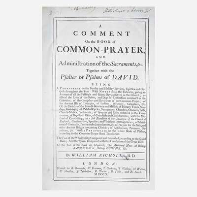 London: Printed for R. Bonwicke, W. Freeman, et. al., 1710. First edition. Folio. (viii), xx, (590), 71, (5) pp. Lacking engraved frontispiece portait. Full contemporary panelled calf, rebacked, stamped in blind and in gilt, red morocco spine label, boards rubbed and lightly blistered, light wear to extremities; all edges trimmed; old ownership signature at head of title-page, scattered minor spotting to text, repairs in gutter and bottom edge of pp. (113/114); armorial book-plate of Miles Bland, D.D., F.R.S. on front paste-down. Bound with: Sternhold, Thomas The Whole Book of Psalms, Collected into Englsh Metre London: Printed for James Roberts, 1739. Reprint. (56) pp. Miles Bland (1786-1867) was an English cleric and mathematician, and fellow of the Royal Society, the Society of Antiquities, and the Royal Astronomical Society.