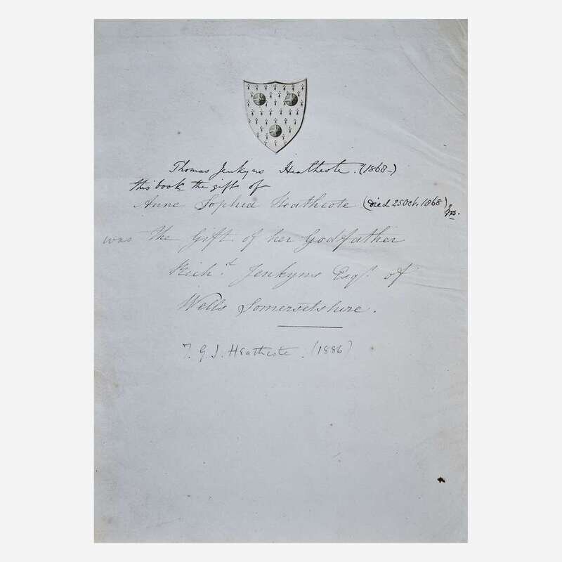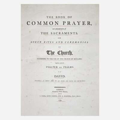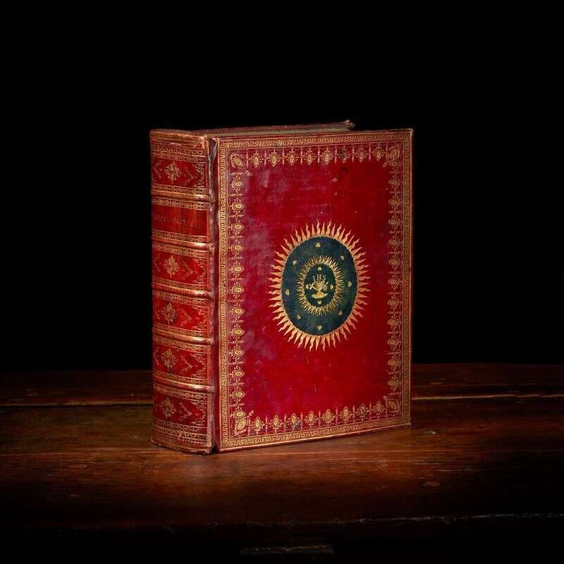 London: Printed by Millar Ritchie, for J. Good and E. Harding, 1794. Thick 4to. (xxviii), (ii), 634 pp. Bound with "A Companion to the Altar...", 63 pp., and "A New Version of the Psalms of David...", (176) pp. Illustrated with 14 engraved plates by Thomas Stothard. Full contemporary red calf, with black leather onlay, elaborately stamped in gilt, joints lightly rubbed, spine ends lightly rubbed and worn, corners lightly worn; all edges gilt; marbled endpapers; previous ownership inscriptions on verso of front free endpaper; scattered spotting to prelims and text, top edge of pp 457/458 torn. Griffiths 8, p. 208; ESTC T88819. A lovely example of a contemporary binding.