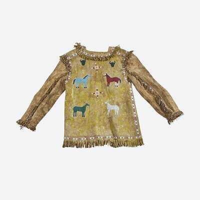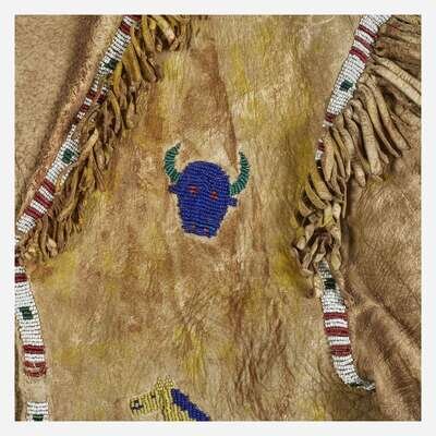 With polychrome beaded horses and buffalo heads to front an back of jacket, heightened with yellow pigment.