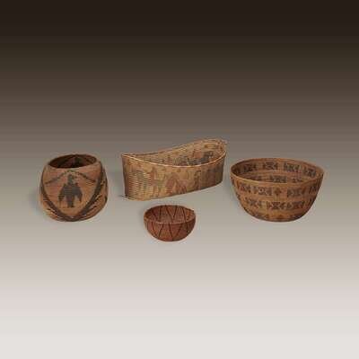 Including pictorial Mission basket, coiled large, deep basket, hand- painted oblong basket, and a small bowl form basket. (4).