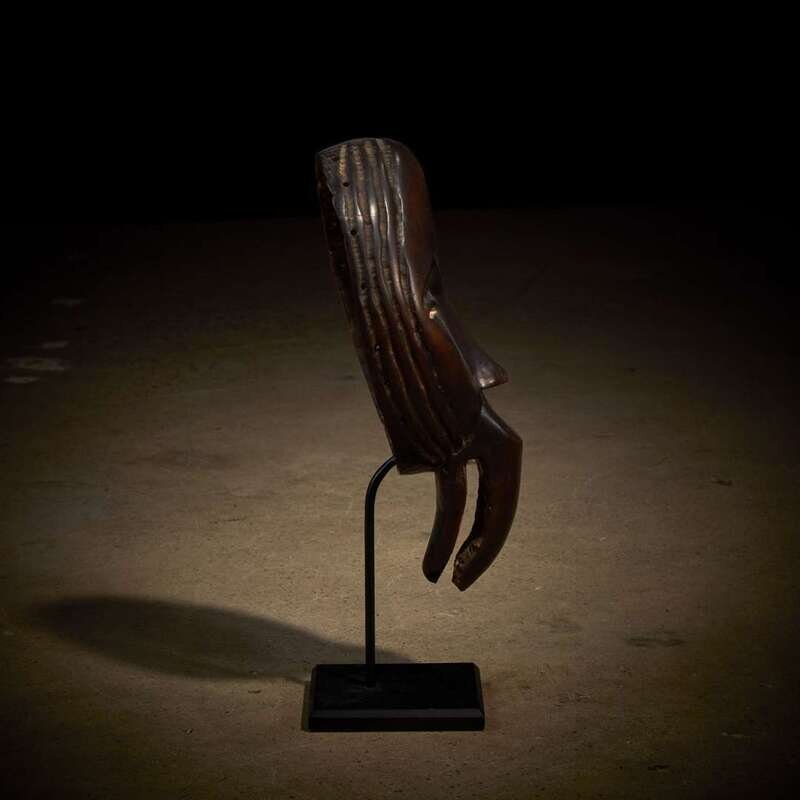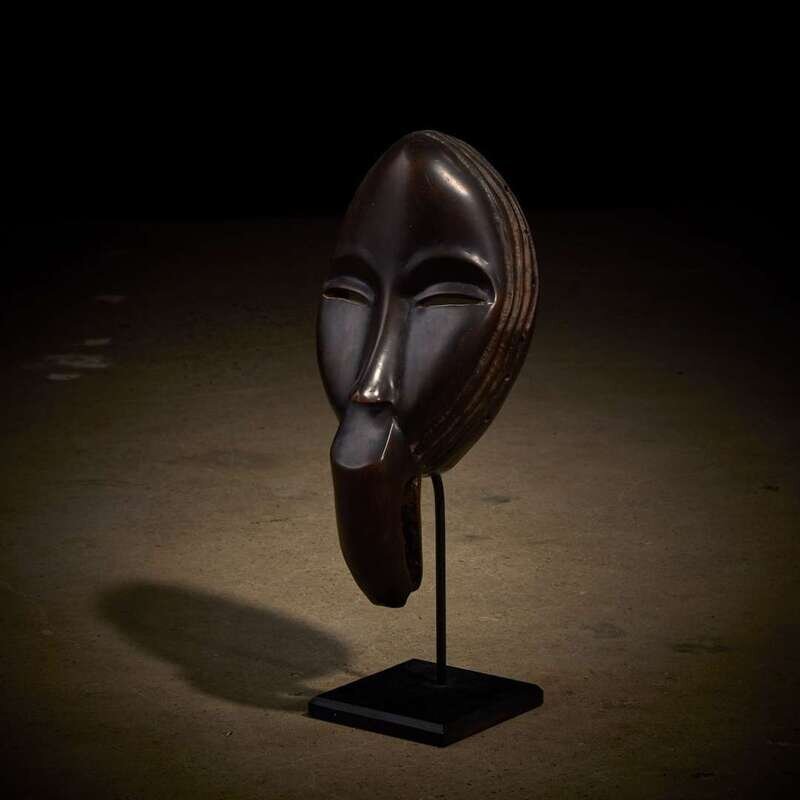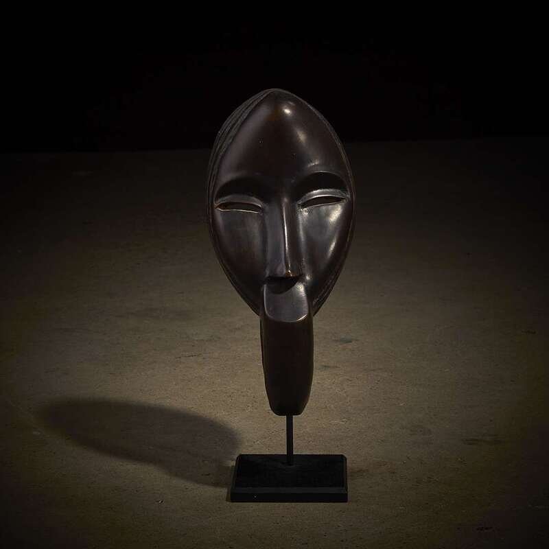 Carved wood, of oval form, with graceful lines, the prominent forehead sits above arching eyebrows and slit eyes, at the mouth the human features morph into an extended bifide beak, with classic glossy black patina, raised on a bespoke mount.