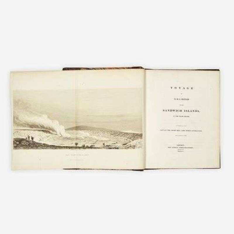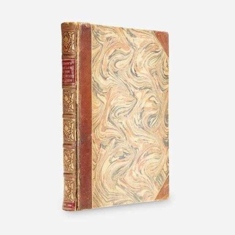 London: John Murray, 1826. First edition. 4to. x, (ii), 260 pp. Illustrated with folding frontispiece, one folding map, and 13 aquatint and engraved plates. Contemporary three-quarter polished brown calf, stamped in gilt, over marbled paper-covered boards, front board detached but present, extremities and corners lightly worn, red leather spine label; matching marbled edges and endpapers; some paper loss in gutter of front free endpaper, scattered minor spotting to text, creasing to frontispiece. From the library of Henry Casimir de Rham (1785-1873), Swiss-American diplomat and one of the first two Swiss consuls to the United States, and with his book-plate on front paste-down. Hill 231. An account of the H.M.S. Blonde's voyage to Hawaii to return the bodies of King Kamehameha ll and Queen Kamamalu, who passed away from measles while on a state visit to London in 1824. The British government sponsored the voyage, with George Anson Byron, cousin of poet Lord Byron, in command. This volume contains an account of the King's visit, as well as a history of British exploration to the Hawaiian islands.