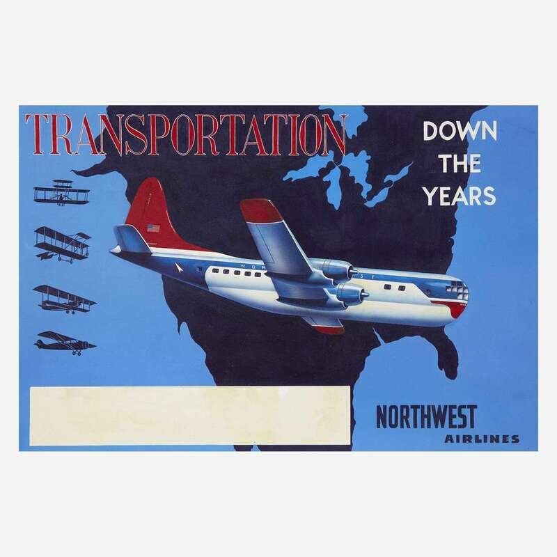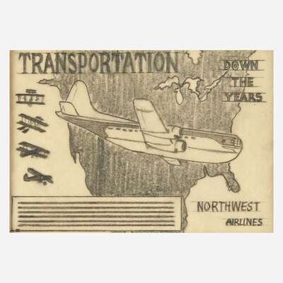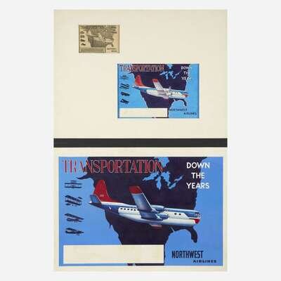 Circa late 1940s/early 1950s. Mixed media on board. Comprising three maquettes from a presumed unrealized Northwest Airlines ad campaign, featuring the slogan "Transportation Down the Years", above a soaring Boeing 377 Stratocruiser. In custom portfolio composed of two 20 x 15 in. boards; main image painted on one board, two other smaller images matted and mounted to other board. Portfolio: 30 x 20 in. (762 x 508 mm); images: 12 x 18 in. (304 x 457 mm), 6 x 9 in. (152 x 228 mm), 3 x 4 1/2 in. (76 x 114 mm).