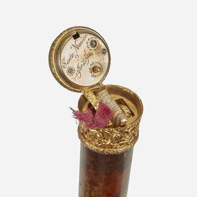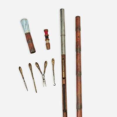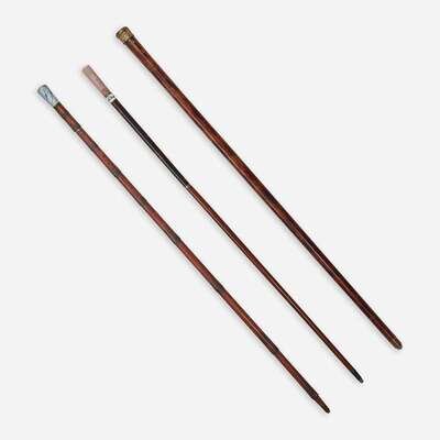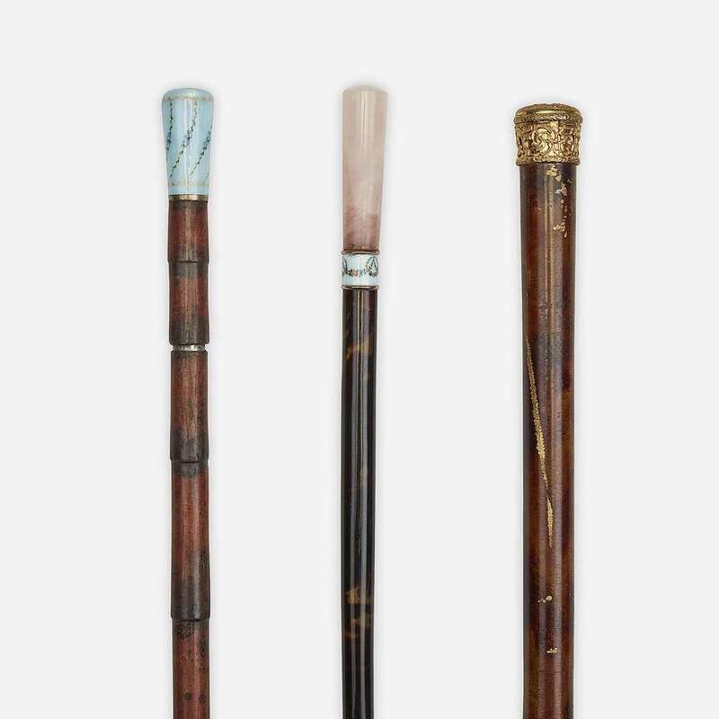 Comprising an Austro-Hungarian silver and guilloché enamel-mounted rose quartz, faux tortoiseshell, and mahogany ladies' walking stick, the ground under the enamel marked with the Dianakopf first standard mark for 95 silver and maker's mark KR, between 1872-1922; an enamel and bamboo ladies' sewing walking stick, the handle en plein and blue parcel-gilt guilloché enamel, the handle opening to reveal wood and steel rod fitted with compartment for turned wood bobbin with threads, a measure, and slots for sewing components including an etui, scissor in two parts, sewing pick, scoop, and button hook; and a French gold fill and faux grained malacca ladies' music box walking stick, the gilt metal filigree handle with push-button hasp to reveal music box, music box winding key, and folding paper fan with imari-style decoration and gilt metal loop, the underside of handle lid bearing later inscription "Santa Monica/18 avril 1966." (3).
