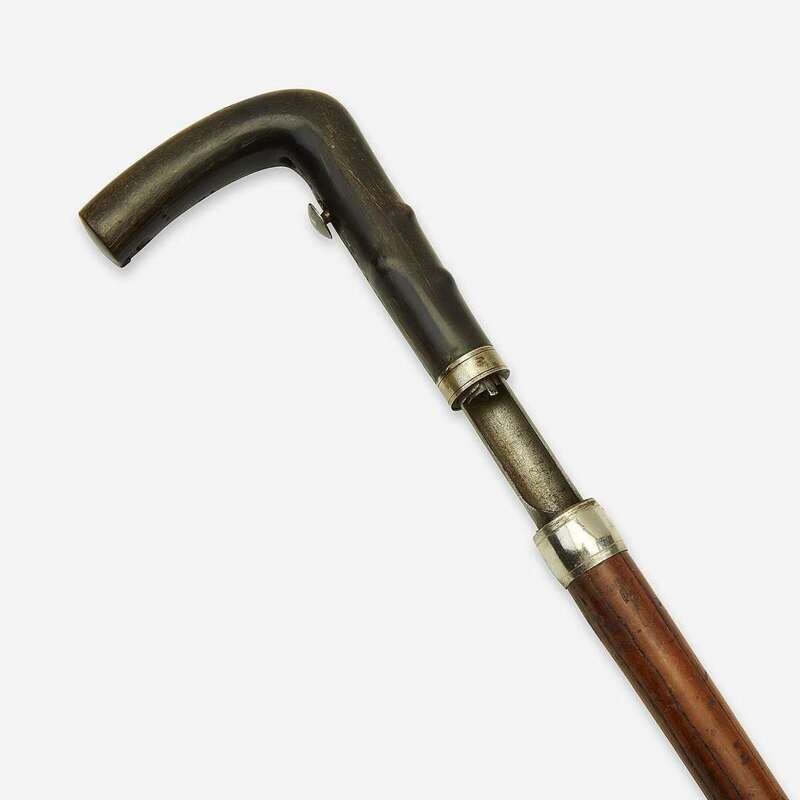 The first a French or British steel-mounted burlwood and hardwood single-shot shotgun cane, twist release to breech, the steel collar rotating to release trigger, with modern rubber ferrule over muzzle, apparently unmarked; the second a French steel-mounted carved horn and malacca single-shot shotgun cane, twist release to breech, with push-button trigger, with modern rubber ferrule over muzzle, the breech marked "DUMONTHIER." (2).