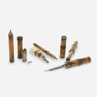 The turned handle releasing to an engraved percussion gun, a release button unsheathing a 4 3/4-inch dagger, the shaft unscrewing in three places to reveal powder horn, gasoline light, telescope, and fittings for musket balls and powder caps, the gun marked "Baucheron Pirmek(?)/a Paris," the blade apparently unmarked.