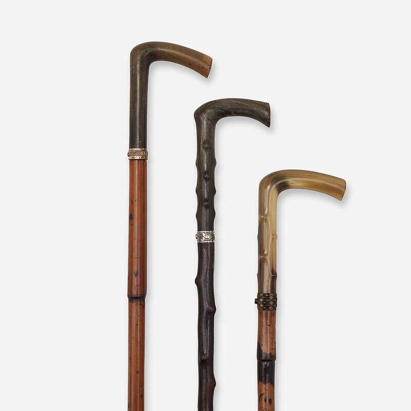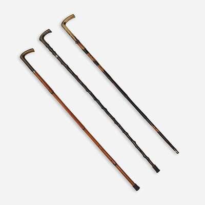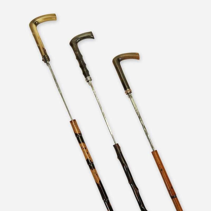 Comprising a gilt metal-mounted horn and bamboo dagger cane, the release button at collar unsheathing a 12-inch Solingen-style steel blade, the blade apparently unmarked, with modern rubber ferrule; a horn and briarwood dagger cane, the release button at collar unsheathing a 14-inch Solingen-style steel blade, with silver-plated copper filigree collar and modern rubber ferrule, the blade apparently unmarked; and a carved horn and spotted bamboo dagger cane, the release button at base of handle unsheathing a 14 1/4-inch steel blade, the blade apparently unmarked. (3).