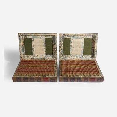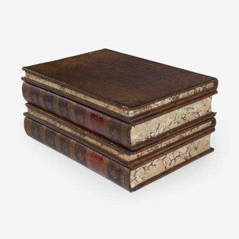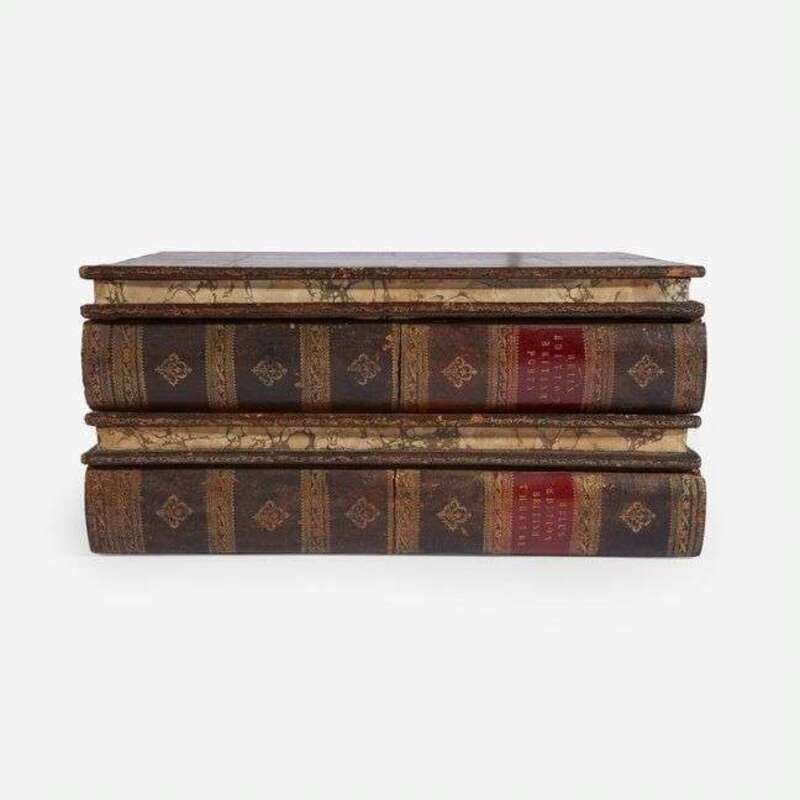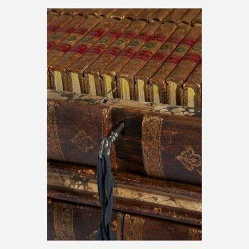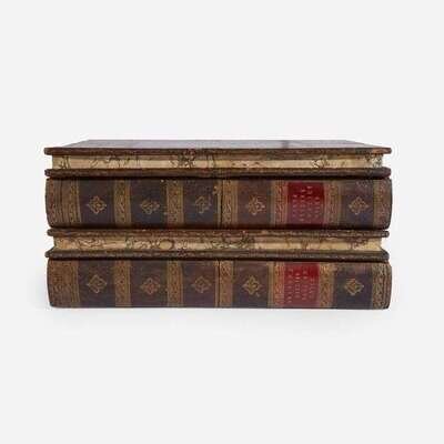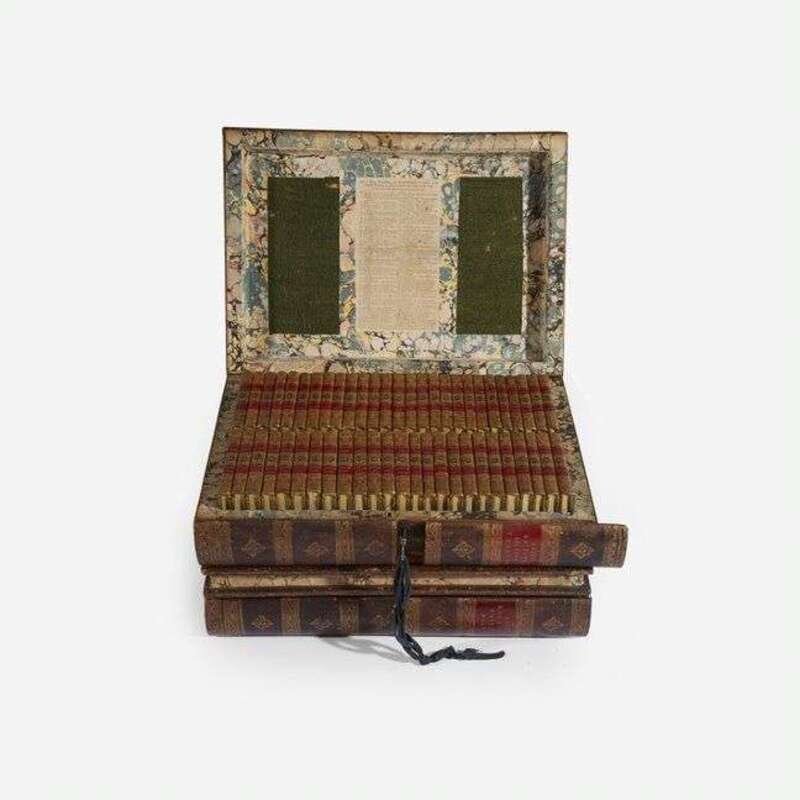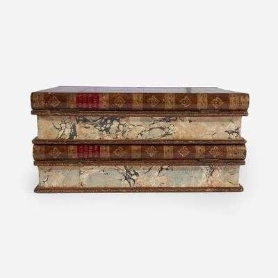 Edinburg: Apollo Press, 1776-82. In 109 volumes. First edition. 12mo. Each volume illustrated with an engraved title-page, numerous volumes with engraved frontispiece portraits of the authors. Full contemporary tree calf, stamped in gilt, red morocco spine labels; edges stained yellow; marbled endpapers. Housed in two original exquisite full tree calf traveling library cases resembling stacked folio books, stamped in blind and in gilt, red morocco spine labels, lightly rubbed and worn; marbled edges with matching interior marbling, and green cloth lining (marbling faded but matches that of the individual volumes); original ad for this set, as well as one for Bell's British Theatre, mounted on lid of each case respectively; sliding compartments on spines contain hidden locking mechanism, original key included. From the library of Melicent Ballard, and with her charming 18th-century engraved pictorial book-plate on front paste-down of all 109 volumes (included in "Ladies' Book-plates" by Norna Labouchere, 1895). A rare, and remarkably well preserved, set of English publisher John Bell's "Poets of Great Britain", complete in their two original traveling library cases resembling four folio volumes. From a 1784 ad for this set: "Two Cases are constructed in the shape and appearance of two folio volumes, which contain the whole of this great collection, and are well adapted for travelling in the seat of a post chaise, or for library furniture." (p. 125, Bonnell. The Most Disreputable Trade: Publishing the Classics of English Poetry 1765-1810).